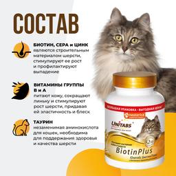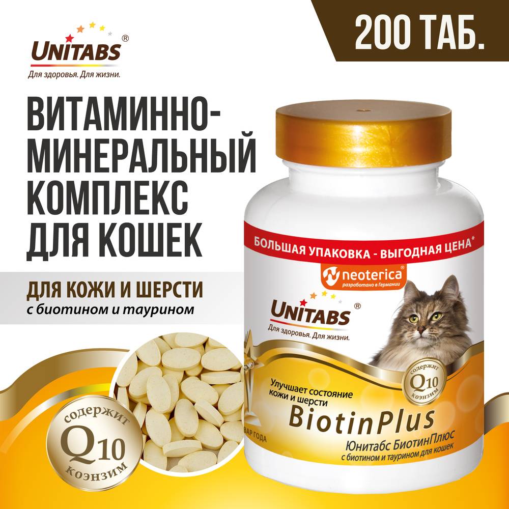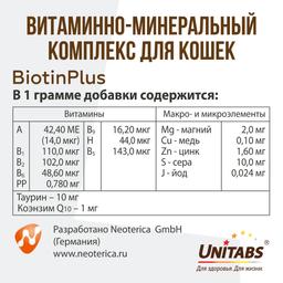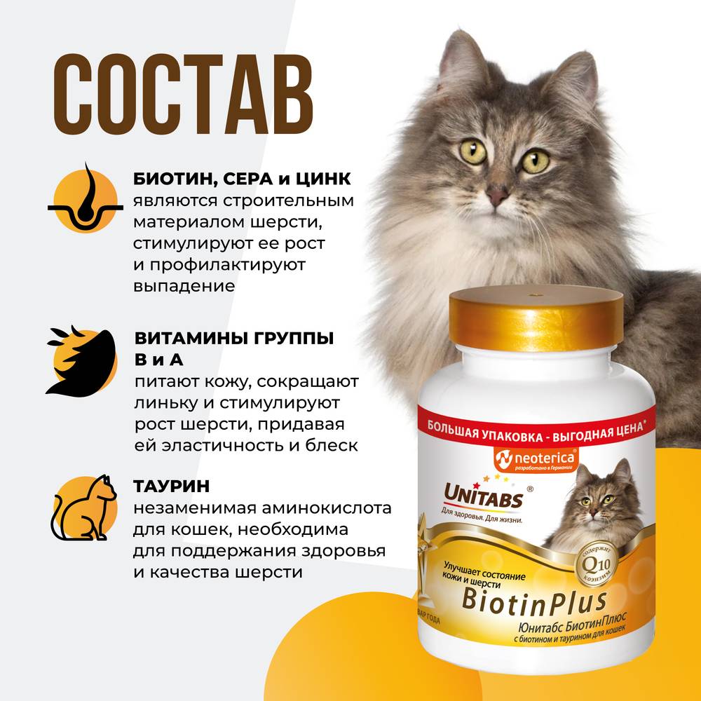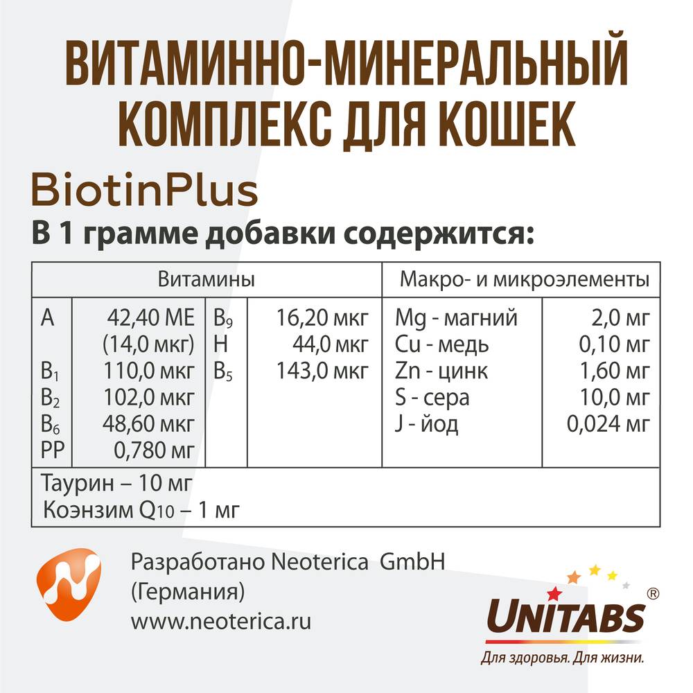 Unitabs BiotinPlus — это витаминно-минеральный комплекс для кошек любого возраста и породы, который содержит коэнзим Q10 и все необходимые витамины, макро- и микроэлементы для улучшения состояния кожи и шерсти. Молочный вкус и запах витаминок придутся по душе привередливым кошкам.