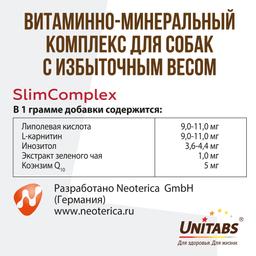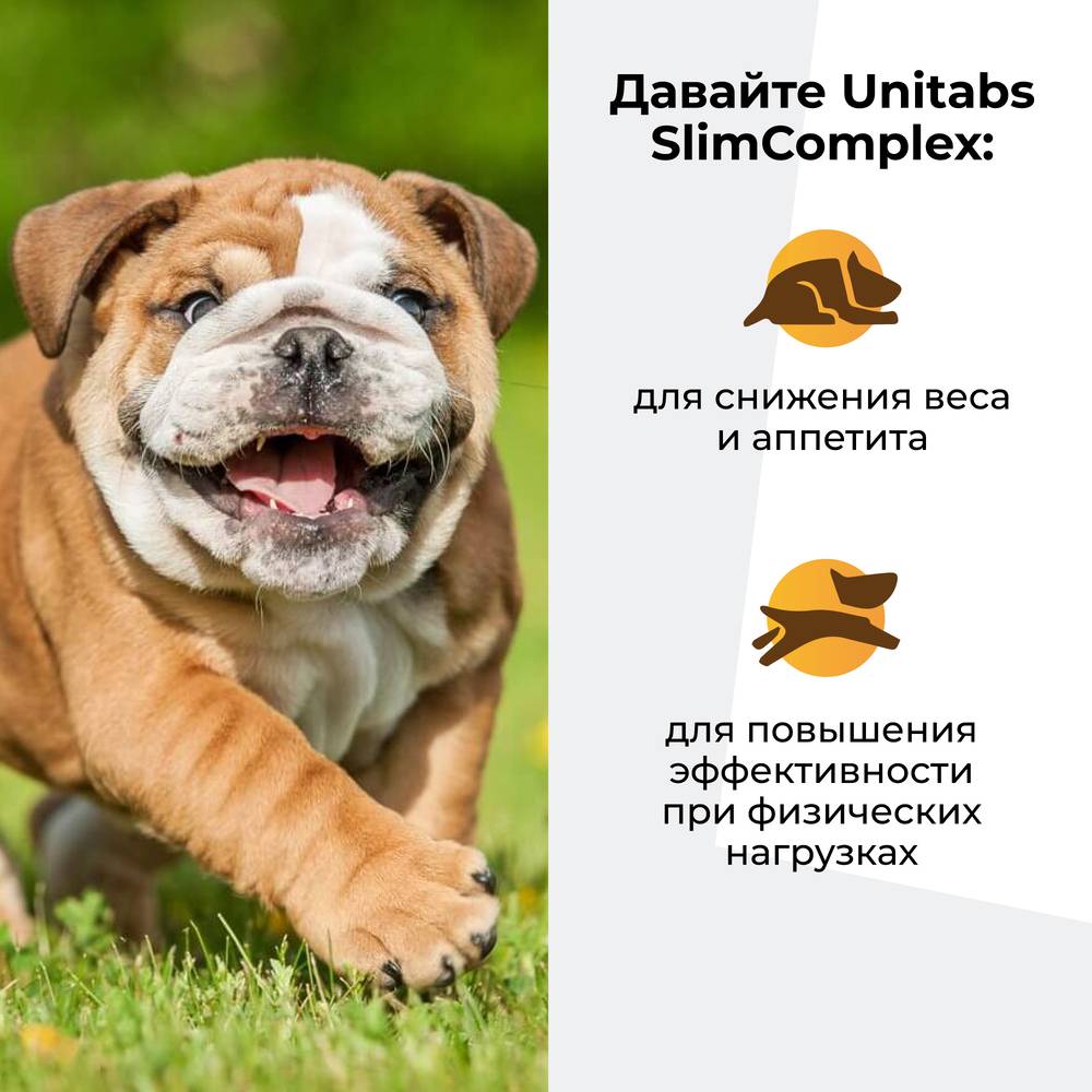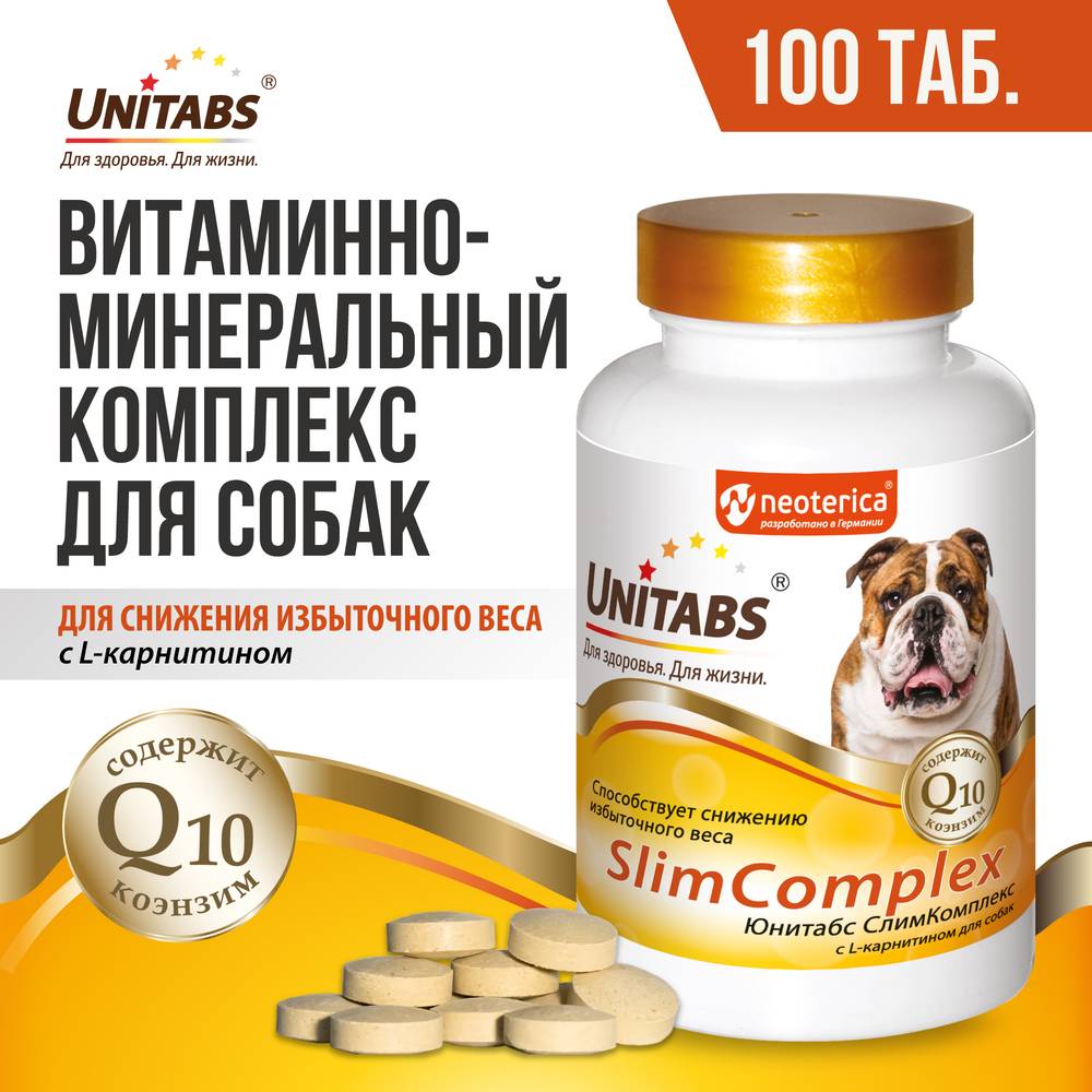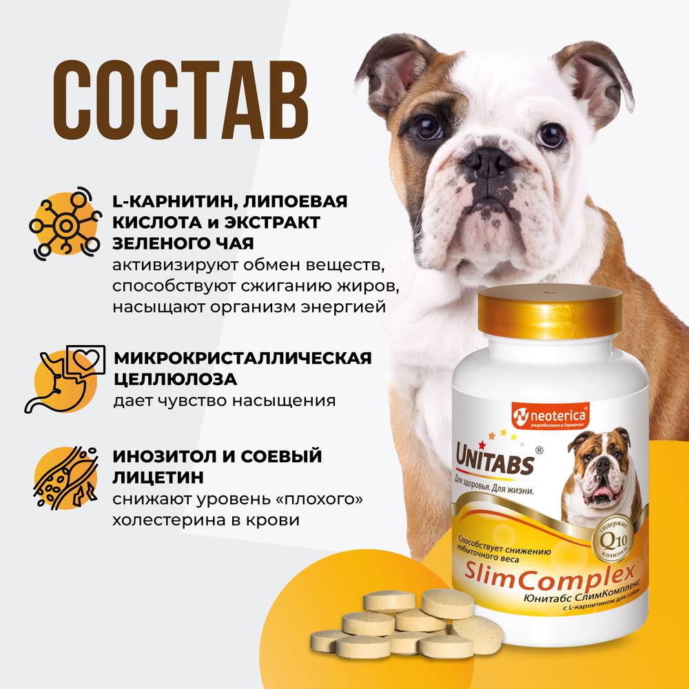 5. Юнитабс СлимКомплекс разработан для снижения избыточного веса у собак. Добавка содержит микрокристаллическую витамины, витамоноподобные вещества, целлюлозу, аминокислоты, коферменты и фосфолипиды, что обеспечивает улучшение метаболизма в организме собак.