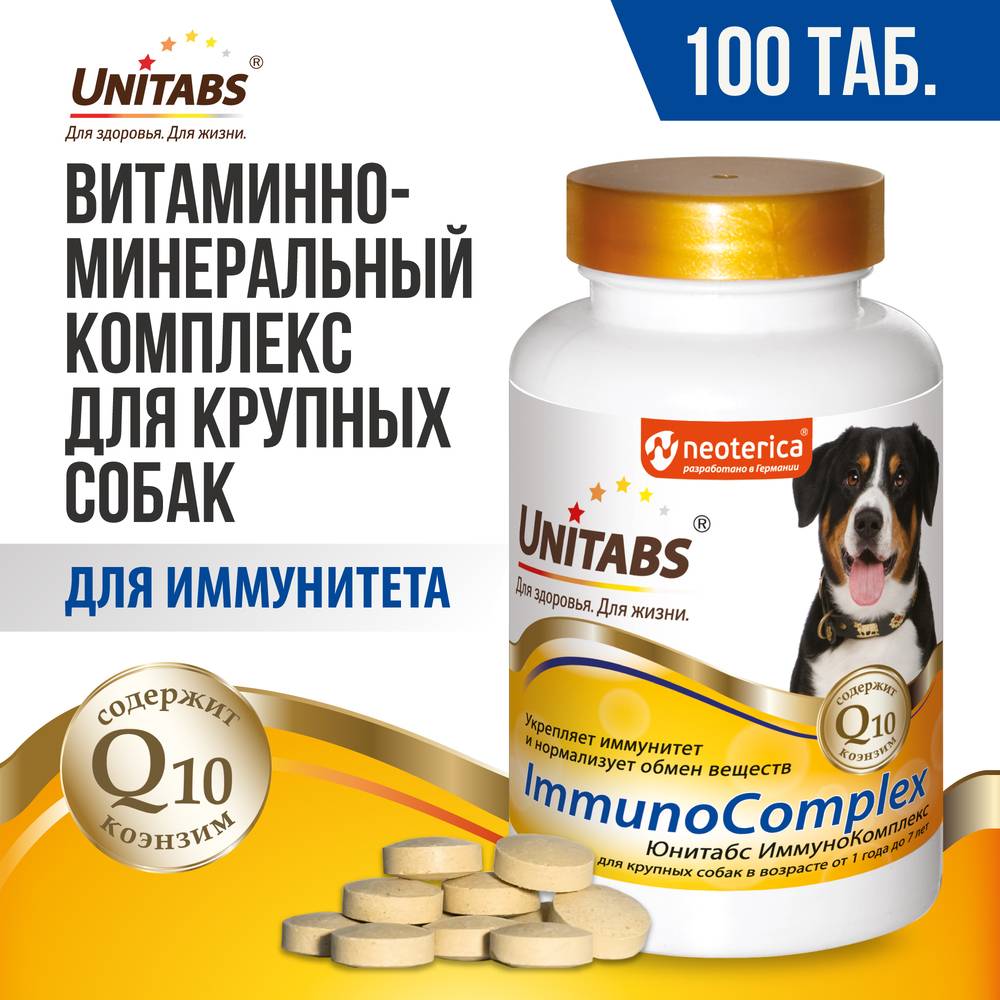 Unitabs ImmunoComplex — это витаминно-минеральный комплекс для взрослых собак, который содержит коэнзим Q10 и все необходимые витамины, макро- и микроэлементы для нормализации обмена веществ и укрепления иммунитета.