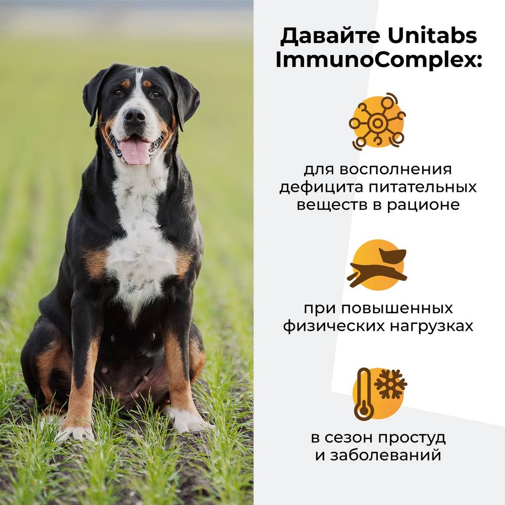 • Юнитабс ИммуноКомплекс применяют собакам в возрасте от 12-18-месячного возраста (в зависимости от породы собак) до 7 лет для поддержания иммунитета и нормализации обмена веществ.