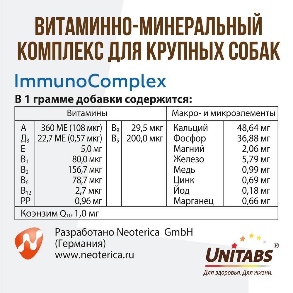 В состав Unitabs ImmunoComplex входит 21 элемент для комплексного действия: коэнзим Q10, витамины А, D3, Е, В1, В2, В6, В12, РР, В9, В5, кальций, фосфор, магний, железо, медь, цинк, йод, марганец, омега-6 и омега-3. Оптимальный баланс витаминов, макро- и микроэлементов способствует повышению иммунной сопротивляемости организма на протяжении всей жизни собаки и в периоды восстановления после болезни.