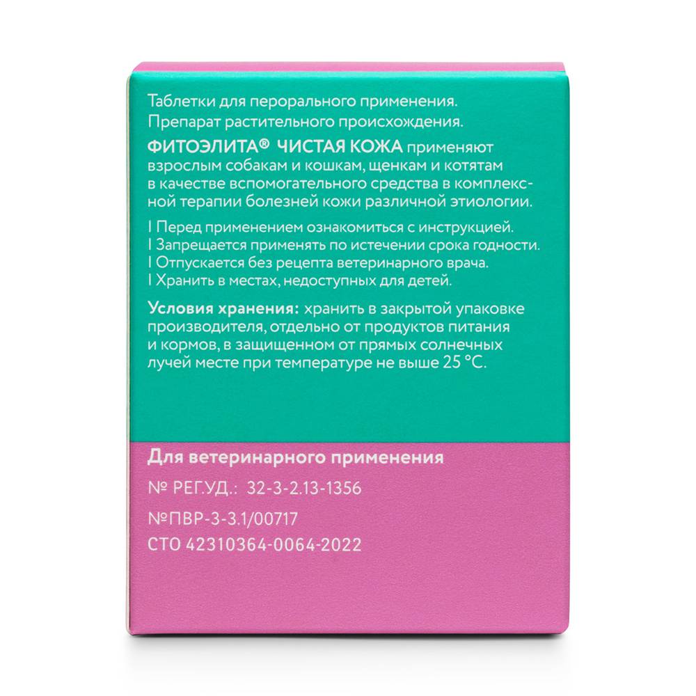 - Фитоэлита Чистая кожа применяют собакам, кошкам, щенкам, котятам как вспомогательное средство при комплексном лечении болезней кожи (бактериальных, грибковых, паразитарных, эндокринных, иммунологических, алиментарных болезней кожи, хронических дерматитов, экзем, алопеций, нарушений пигментации) в качестве противовоспалительного, противоаллергического, болеутоляющего, противозудного, поливитаминного, противомикробного, эпителизирующего, иммуномодулирующего, общеукрепляющего фитосредства.