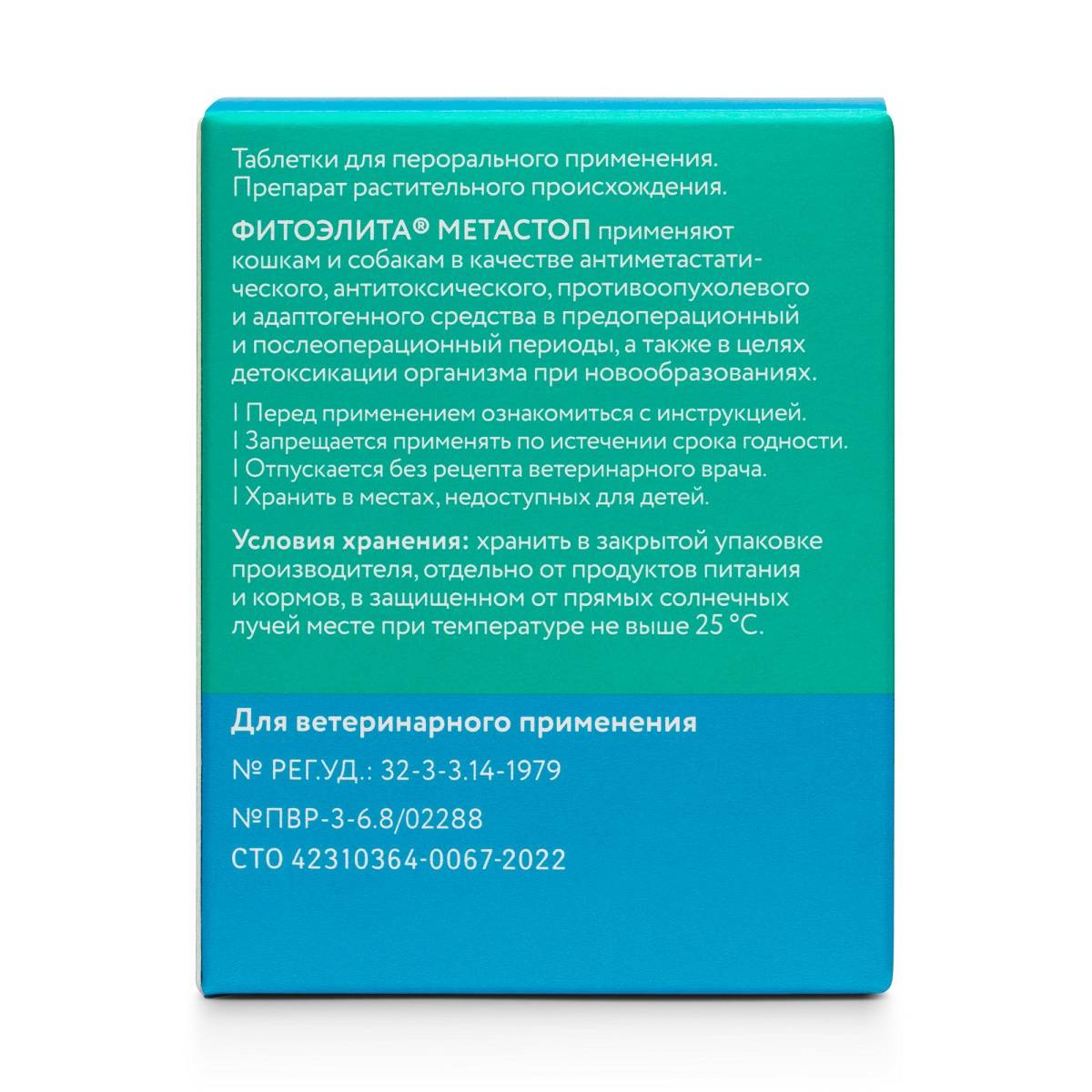 ФИТОЭЛИТА® МЕТАСТОП применяют кошкам и собакам в качестве антиметастатического, антитоксического, противоопухолевого и адаптогенного средства, в предоперационный и послеоперационный периоды, а также в целях детоксикации организма при новообразованиях.