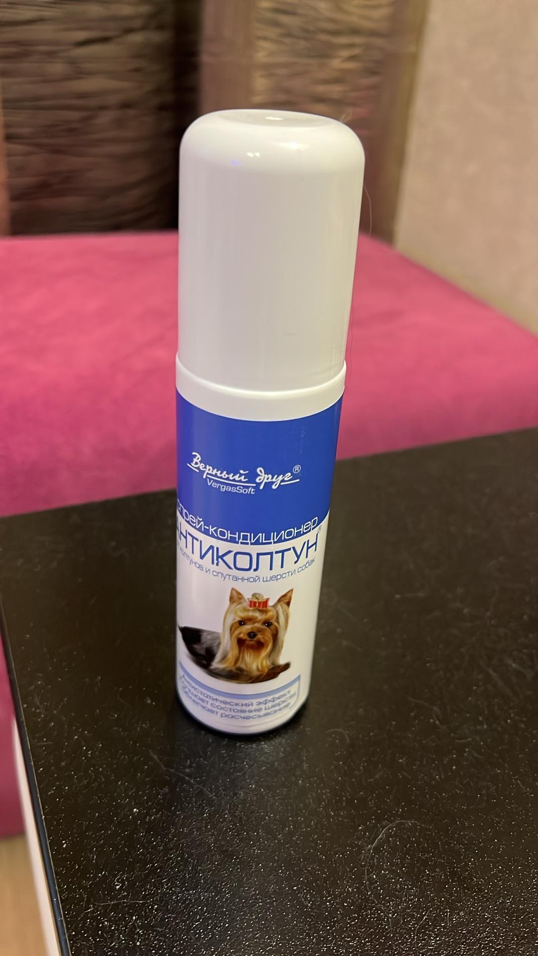 Спрей кондиционер "ВЕРНЫЙ ДРУГ" Антиколтун обладает выраженным антистатическим эффектом,увлажняет, облегчает расчесывание и предотвращает спутывание шерсти. Придает шерстному покрову шелковистость и блеск.