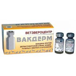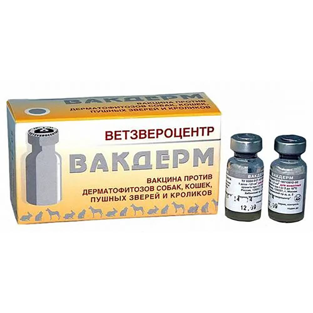 Вакдерм 1 мл (1 доза) – вакцина для прививания котов, собак, кролей и других пушных зверей. Предназначена для выработки иммунитета к дерматофитозам (грибковому поражению кожи), а так же для предупреждения лишая. У питомцев появляется иммунитет на 25-30 сутки после повторного введения препарата. Длительность действия защиты не менее 1 года.