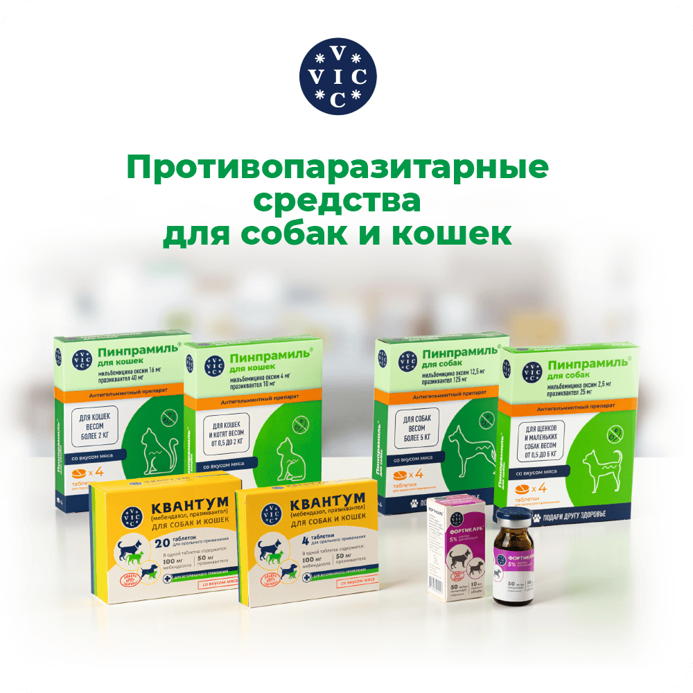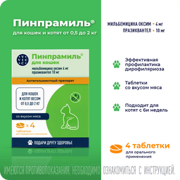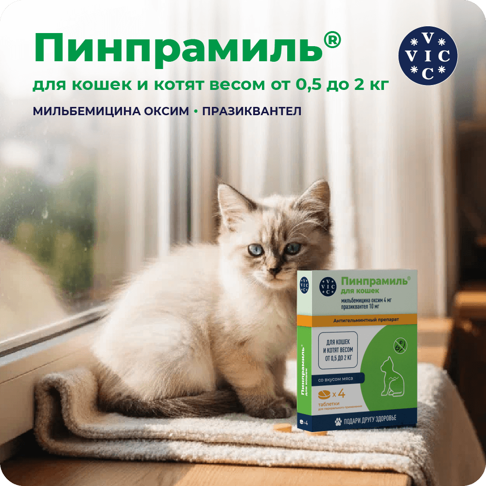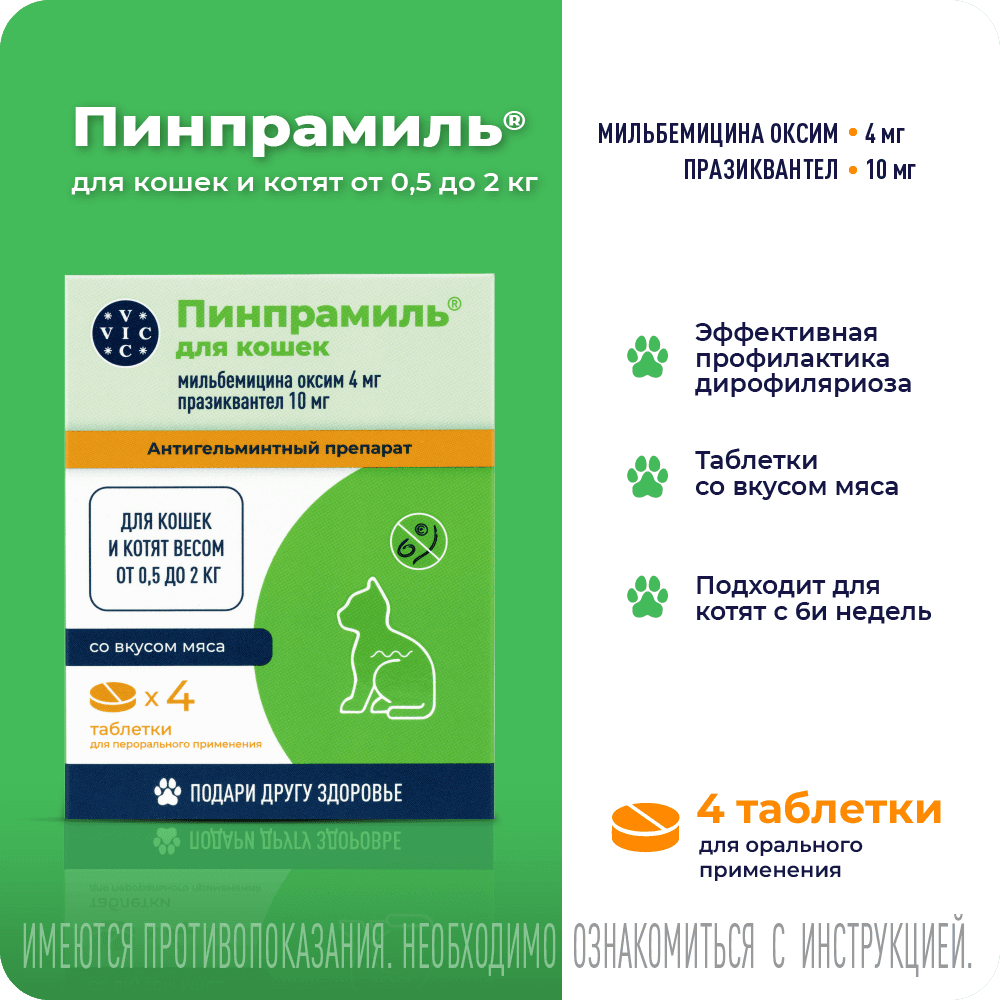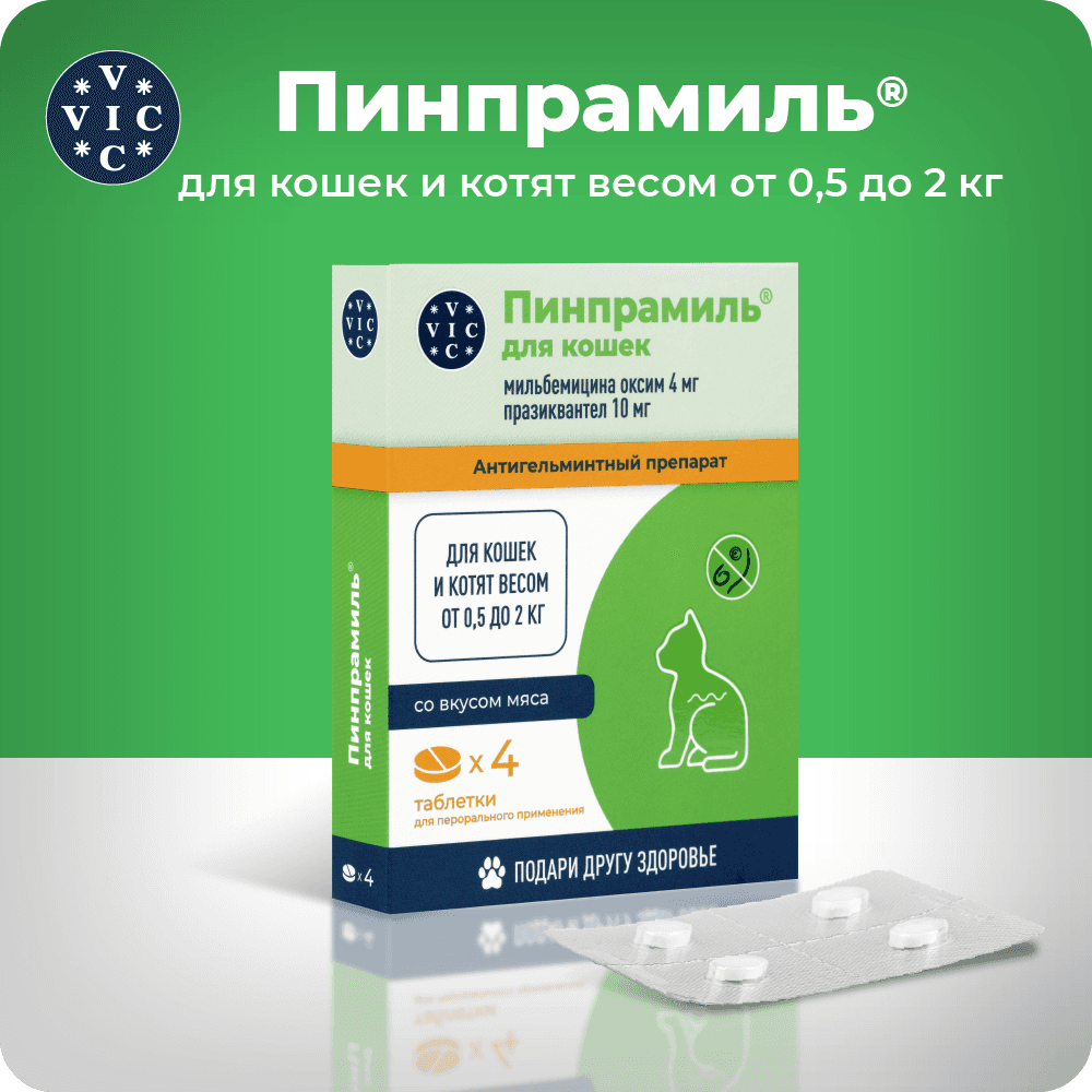 Празиквантел является ацилированным производным пиразинизохиналина. Обладает выраженным действием против цестода и нематод. Повышая проницаемость клеточных мембран паразита для ионов кальция (Са2+), вызывает деполяризацию мембран, сокращение мускулатуры и разрушению тегумента, что приводит к гибели паразита и способствует его выведению из организма животного. Максимальная концентрация празиквантела в плазме крови кошек достигается через 1 час, выводится из организма в основном в виде неактивных метаболитов с мочой, период полувыведения составляет около 3 часов.