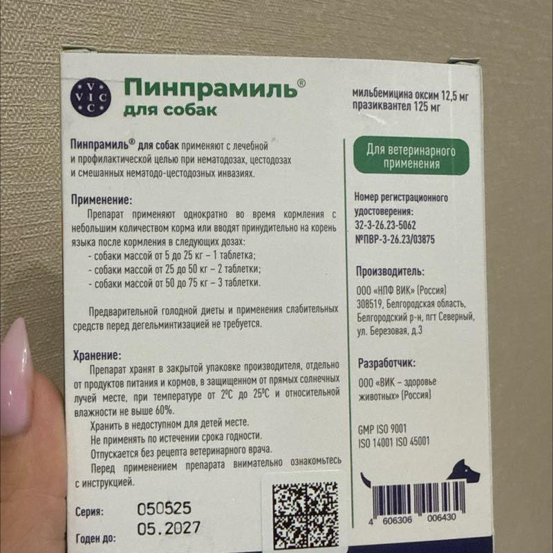 Пинпрамиль® для собак применяют однократно с руки или во время кормления с небольшим количеством корма в минимальной терапевтической дозе 0,5 мг мильбемицина оксима и 5 мг празиквантела на 1 кг массы животного.Предварительной голодной диеты и применения слабительных средств перед дегельминтизацией не требуется.