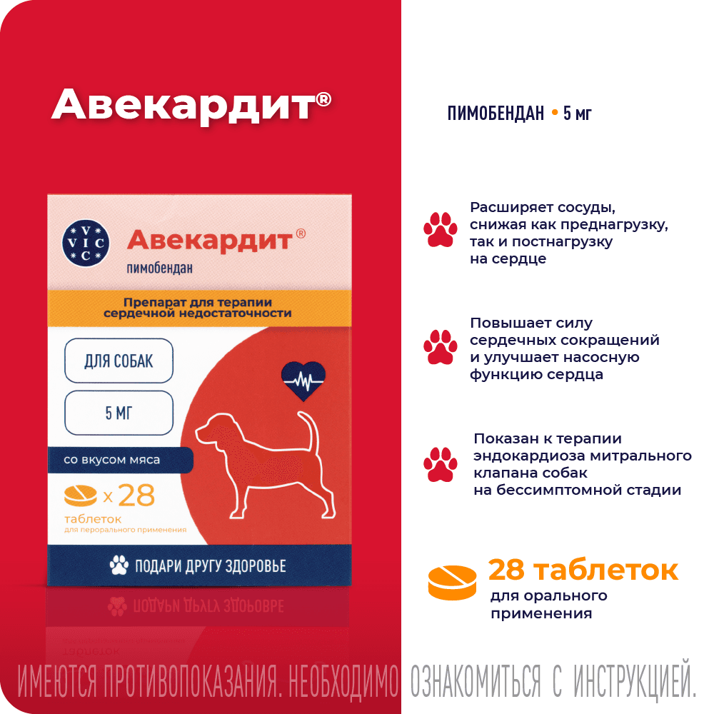АВЕКАРДИТ® назначают собакам для лечения сердечной недостаточности вызванной дилатационной кардиомиопатией, нарушениями со стороны двустворчатых и трехстворчатых клапанов. К другим причинам, вызывающим развитие сердечной недостаточности, принадлежат кардиосклероз, миокардит, перикардит, инфаркт миокарда, врожденные пороки, артериальная гипертензия. Иногда патологическое состояние развивается на фоне длительного пребывания гельминтов в организме питомца.