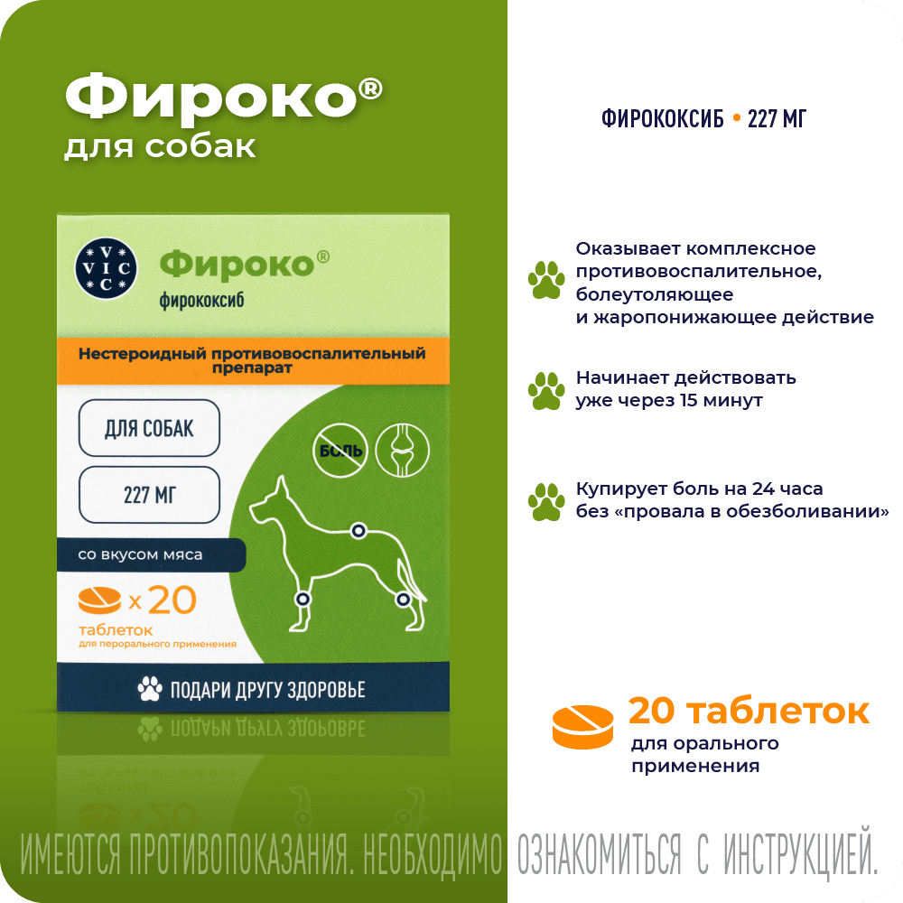 Фирококсиб является селективным ингибитором циклооксигеназы-2 (СОХ-2), избирательно нарушает образование простагландинов, участвующих в формировании воспалительной реакции, подавляет экссудативную и пролиферативную фазы воспаления. Действует преимущественно в очаге воспаления и практически не влияет на продукцию простагландинов, регулирующих почечный кровоток и целостность слизистой оболочки желудочно-кишечного тракта. Оказывает болеутоляющее, противовоспалительное и жаропонижающее действие. После перорального введения собакам в рекомендованной дозе фирококсиб быстро всасывается, максимальная концентрация в крови достигается через 1,25 часа.