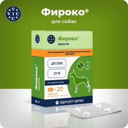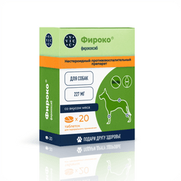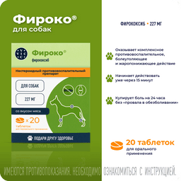 Фироко® таблетки 57 мг и 227 мг применяют собакам индивидуально перорально один раз в сутки в дозе 5 мг фирококсиба на 1 кг массы животного. Продолжительность курса лечения при остеоартрозах зависит от состояния животного и определяется лечащим ветеринарным врачом. Применение препарата до 90 дней следует проводить под регулярным контролем ветеринарного врача. Для облегчения послеоперационных болей и воспаления при операциях на мягких тканях, ортопедических и стоматологических операциях препарат применяют за 2 часа до начала операции, а затем по необходимости 1 раз в сутки, в течение 2-3 суток.