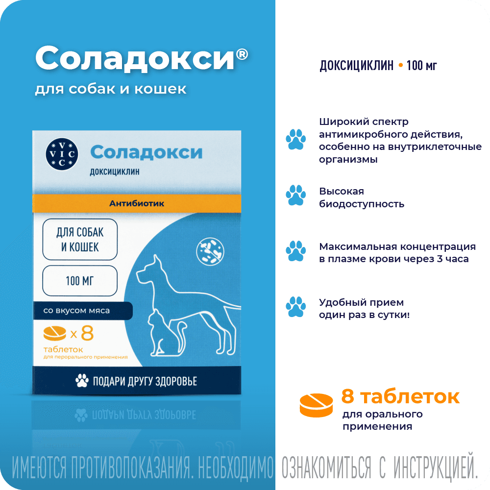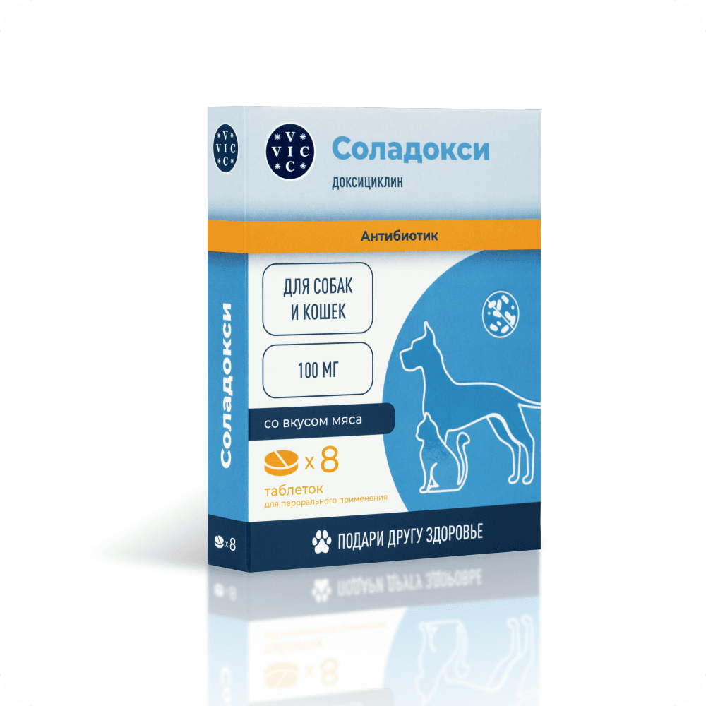 Соладокси назначают кошкам и собакам при болезнях органов дыхания (ринит, тонзиллит, бронхопневмония), мочеполовой системы (цистит, пиелонефрит, простатит, эндометрит), кожи (гнойные дерматиты, абсцессы) и других инфекциях, возбудители которых чувствительны к доксициклину.