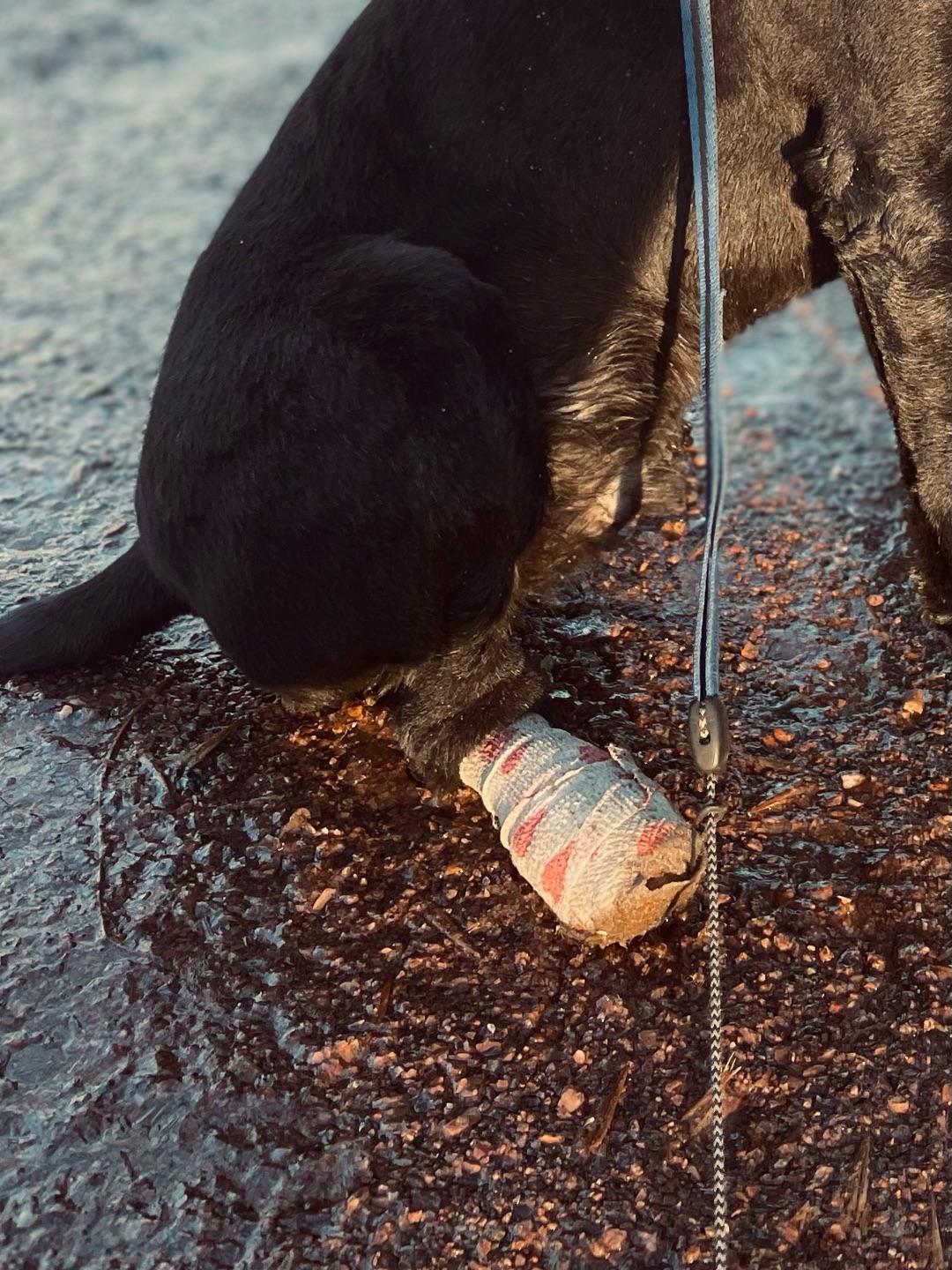 Собака у меня видео не привередливая, ее не напугала горькая пропитка, все равно пыталась снять, в один момент даже получилось сгрызть. Лайфхак: так же бинт можно использовать для фиксирования носков на прогул...