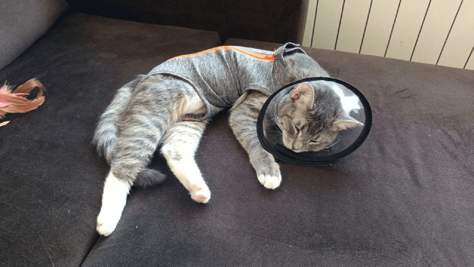 Удобная в использовании, в отличие от попоны на завязках, которые периодически развязываются и кошка дотягивалась до швов, эта очень спасала.