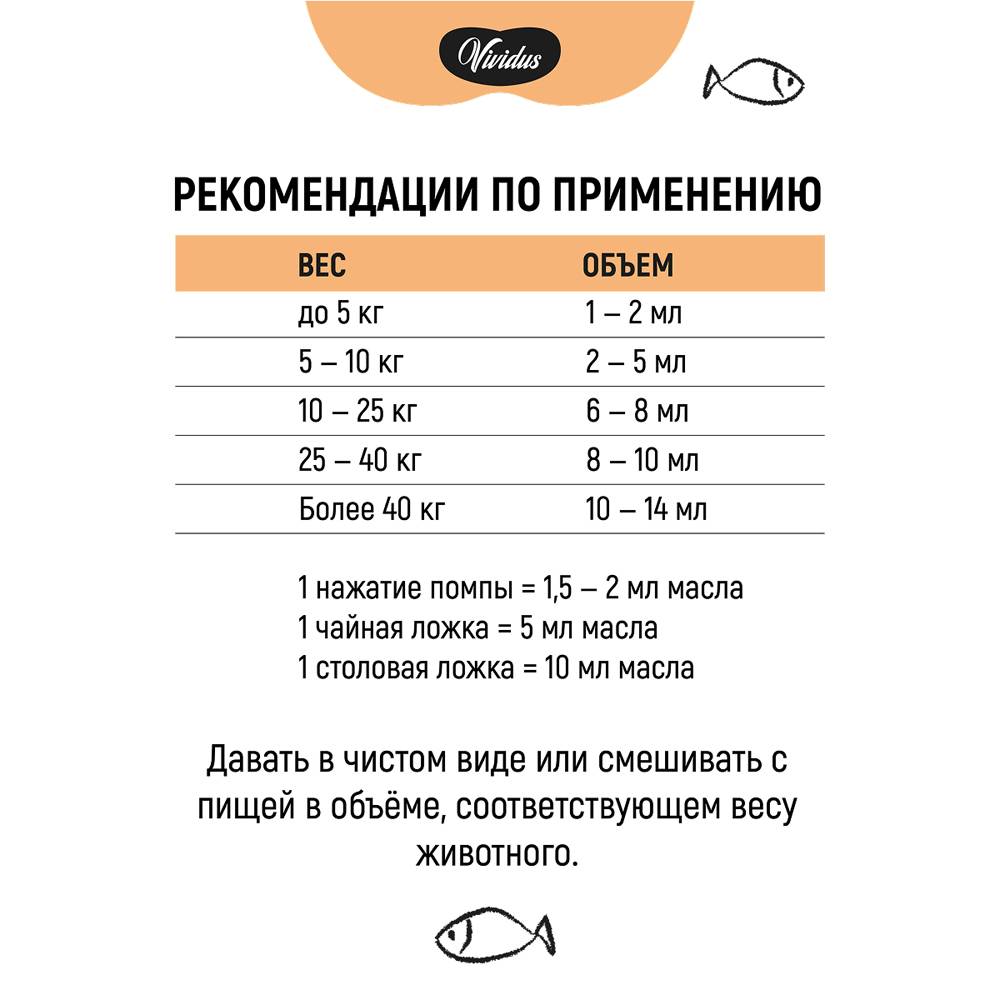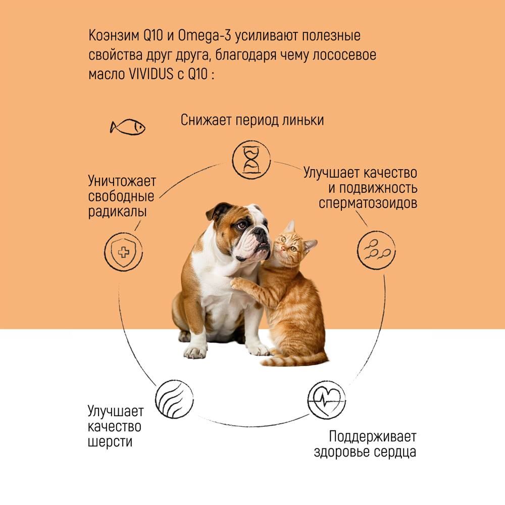 Систематический прием оказывает благоприятное действие на организм животного, улучшение качества шерсти, она становится здоровой и блестящей, сокращается период линьки, уменьшение боли в суставах при артритах и артрозах, укрепление иммунитета, улучшение аппетита. Масло из дикого камчатского лосося Vividus обладает одним из самых высоких показателей содержания полиненасыщенных жирных кислот OMEGA 3 - 36%. Здоровая кожа и красивая шерсть.