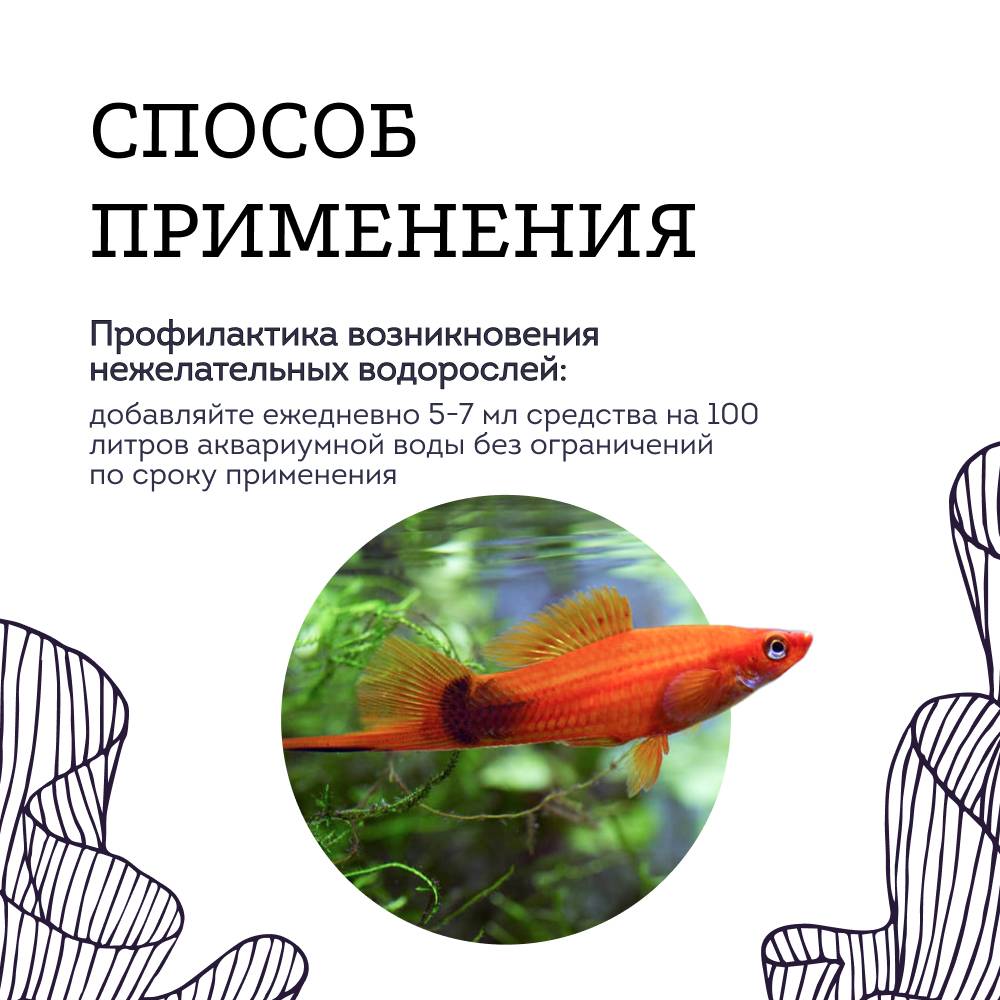 - Для профилактики возникновения нежелательных водорослей добавляйте ежедневно 5-7 мл кондиционера на 100 литров аквариумной воды без ограничений по сроку применения.