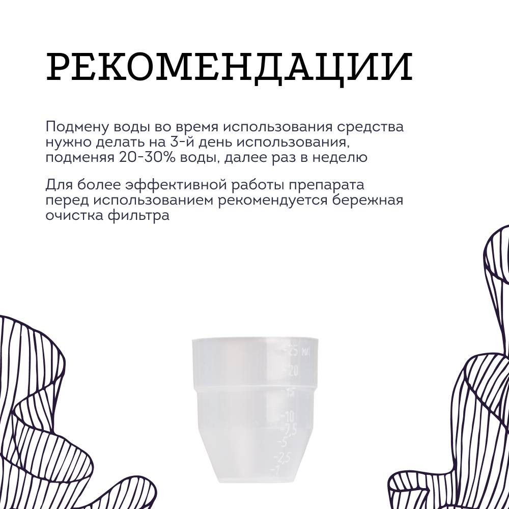 - Подмену воды во время использования средства нужно делать на 3-й день использования, подменяя 20-30% воды, далее – раз в неделю. Для более эффективной работы препарата перед использованием рекомендуется бережная очистка фильтра.