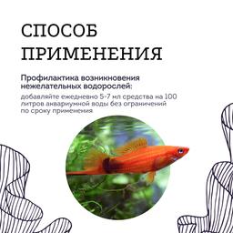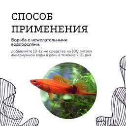 - Для борьбы с нежелательными водорослями добавляйте 10-12 мл средства на 100 литров аквариумной воды в день в течение 7-21 дня.