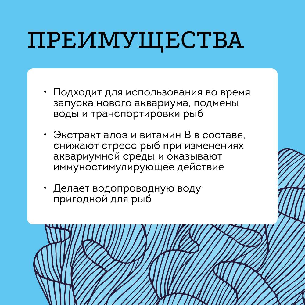 • Делает водопроводную воду пригодной для обитания аквариумных рыбок.