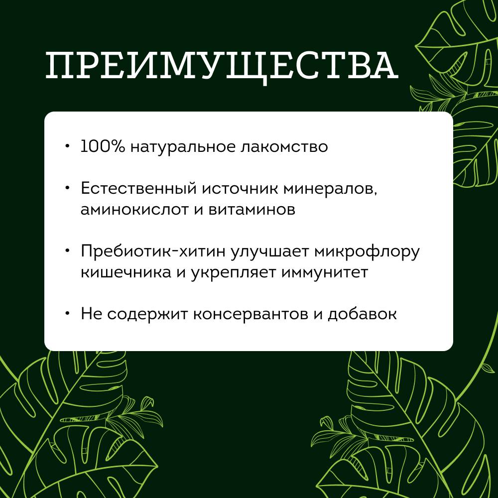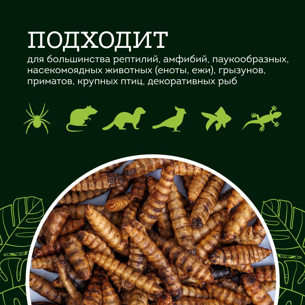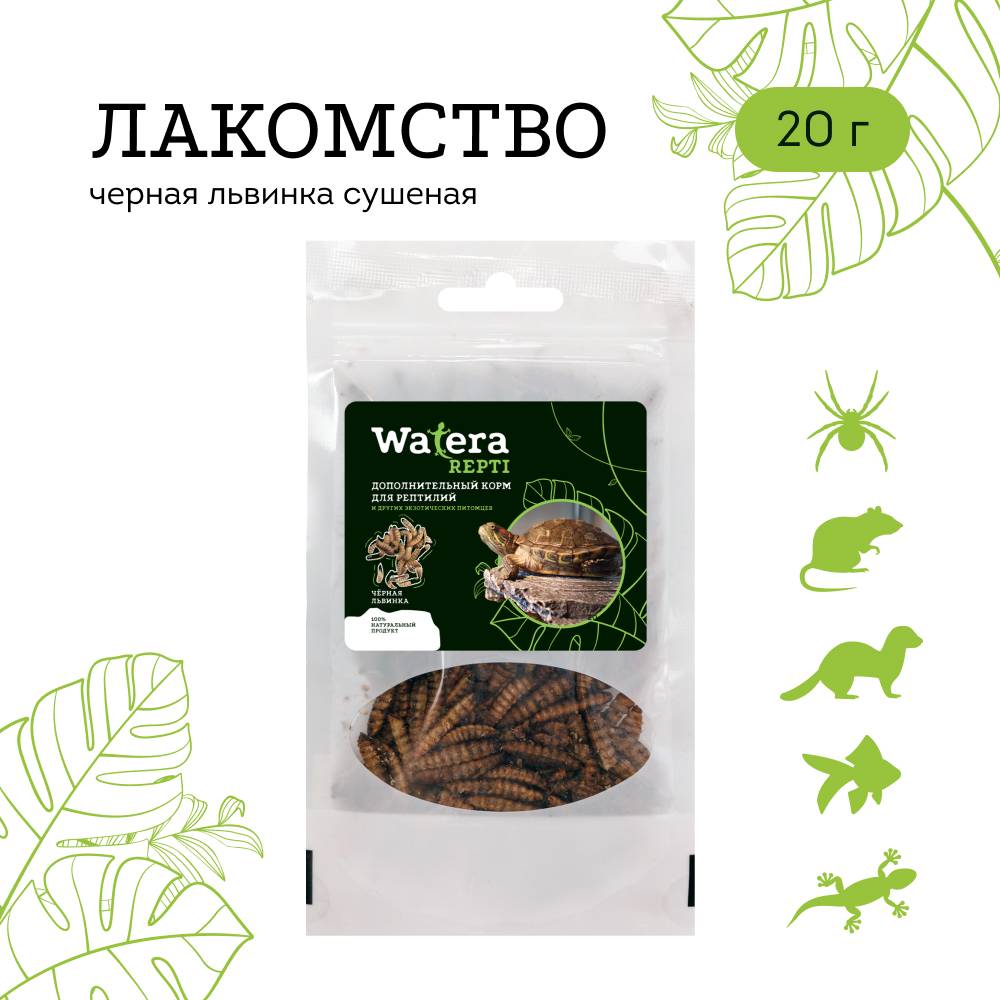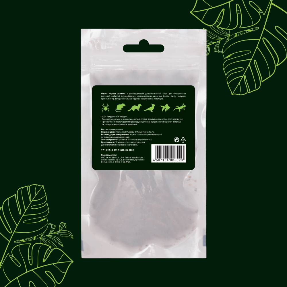 Черная львинка сушеная от Watera – универсальное лакомство для большинства рептилий, амфибий, паукообразных, насекомоядных животных (еноты, ежи), грызунов, приматов, крупных птиц, декоративных рыб и других экзотических питомцев.