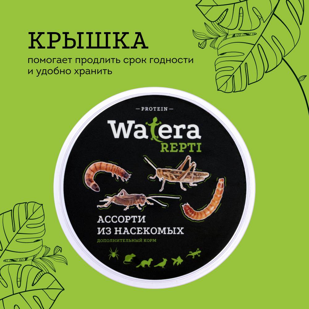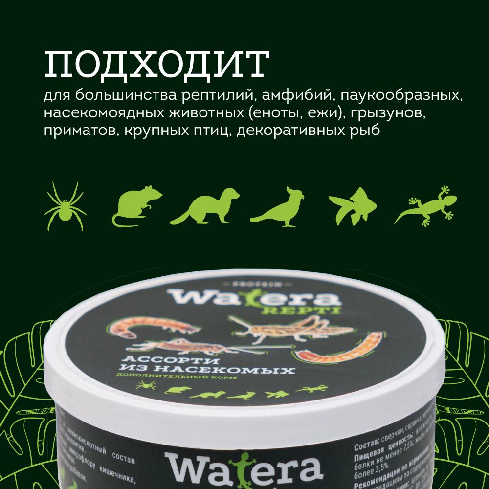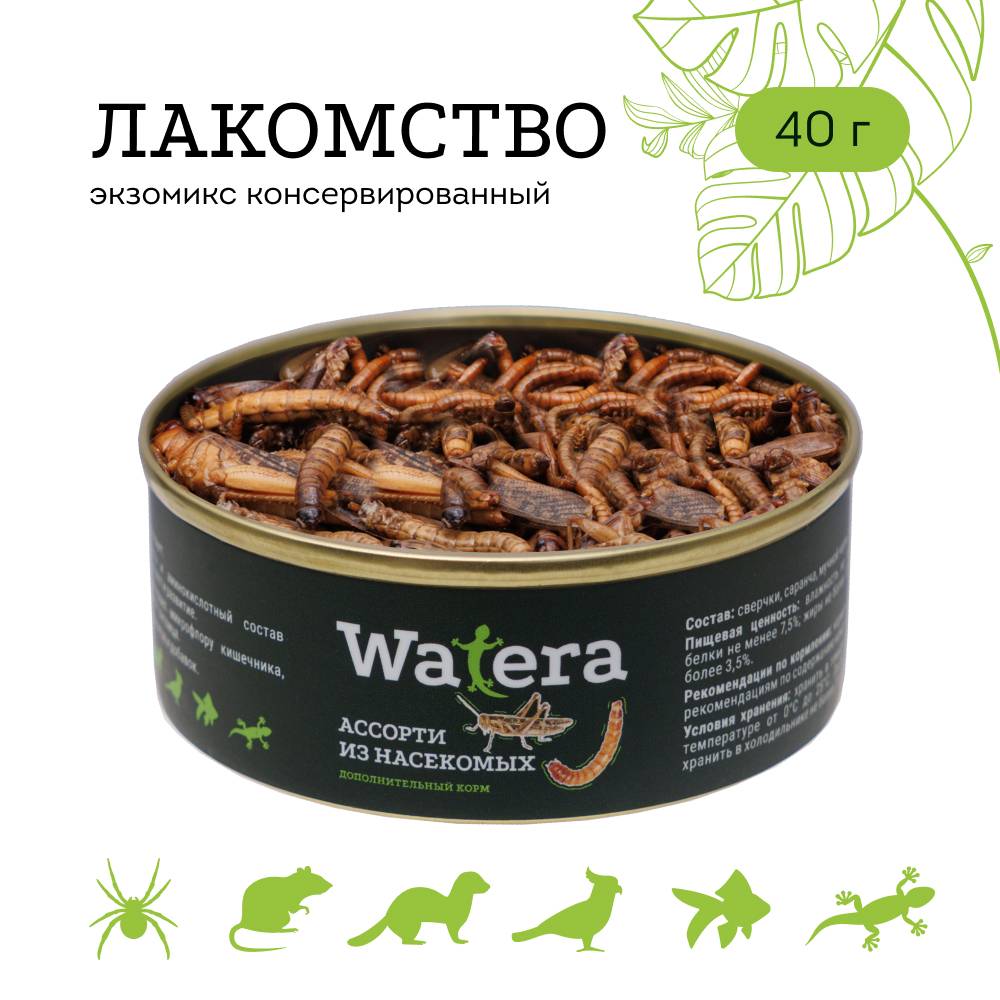 Экзомикс консервированный от Watera – универсальное лакомство для большинства рептилий, амфибий, паукообразных, насекомоядных животных (еноты, ежи), грызунов, приматов, крупных птиц, декоративных рыб и других экзотических питомцев.