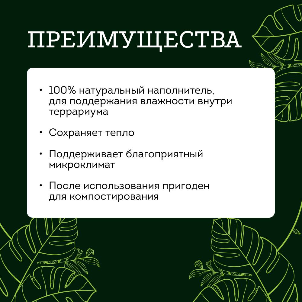 Watera Кокосовый субстрат для террариумов – это натуральный наполнитель, который прекрасно подходит для поддержания влажности внутри террариума и является идеальной средой для амфибий, рептилий, улиток и насекомых.