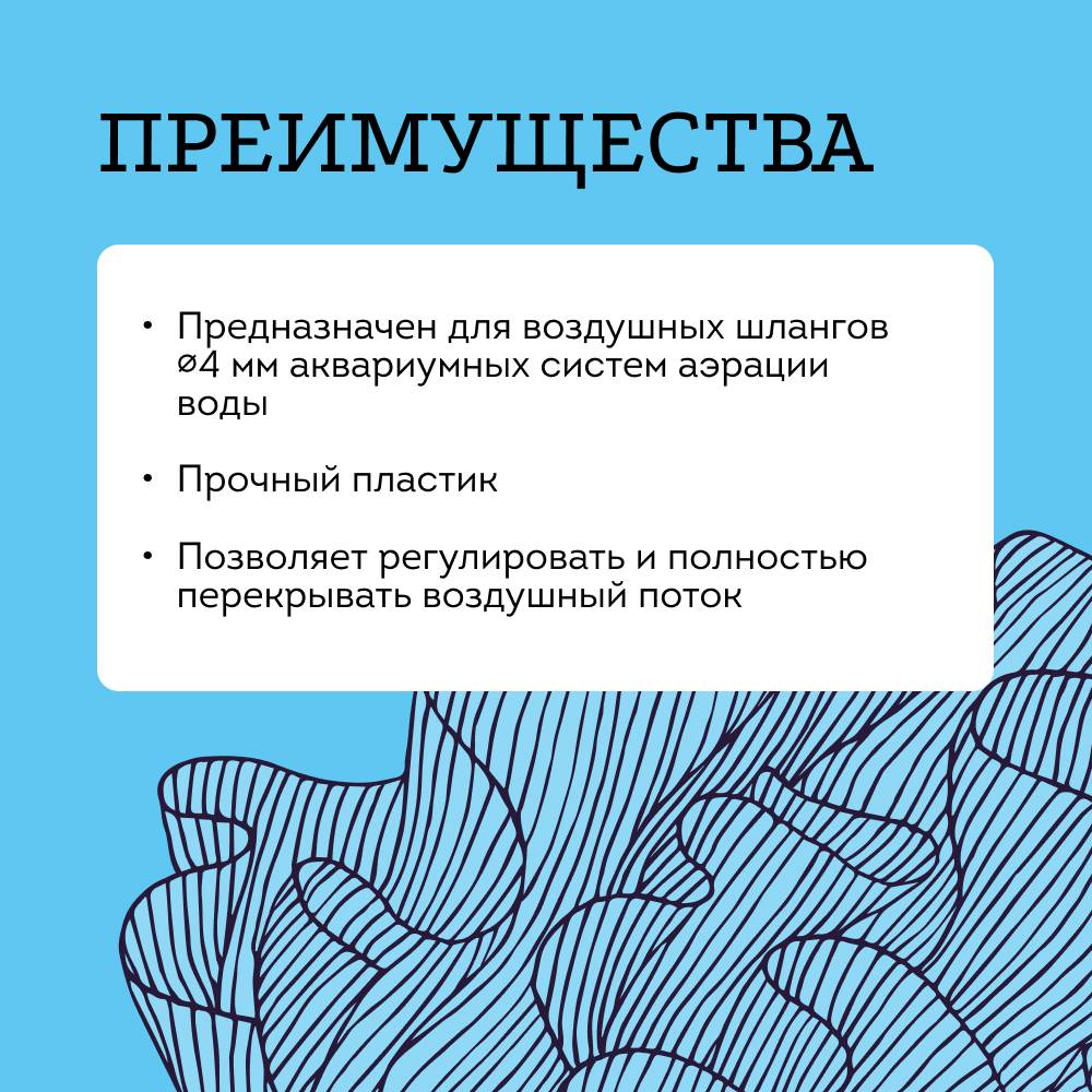 Кран воздушный предназначен для воздушных шлангов диаметром 4 мм аквариумных систем аэрации воды. Устанавливается в разрыв воздушного шланга между аквариумным компрессором и распылителем воздуха.