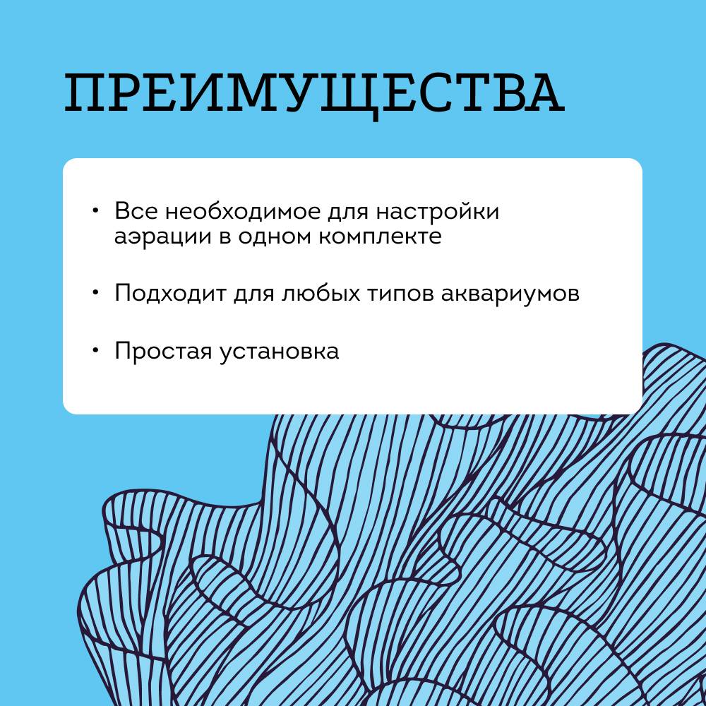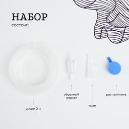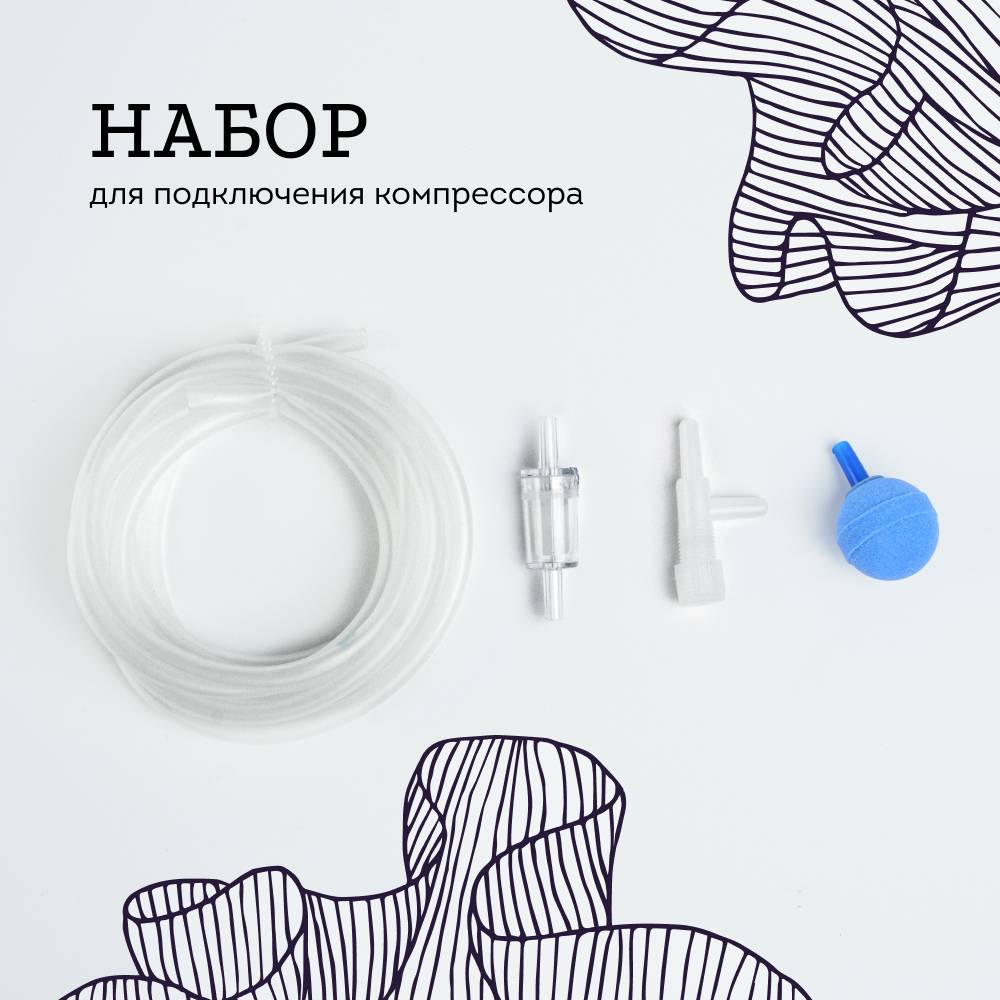Набор предназначен для аэрации воды в аквариуме. Все необходимые комплектующие для подключения компрессора в одном наборе.