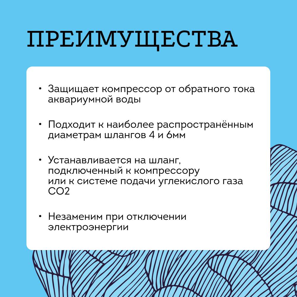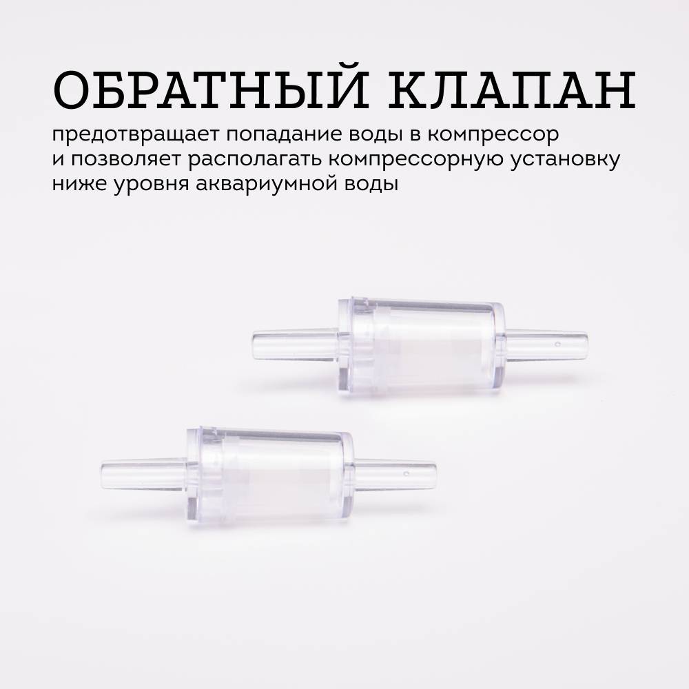 Обратный клапан Watera предотвращает попадание воды в компрессор и позволяет располагать компрессорную установку ниже уровня аквариумной воды.