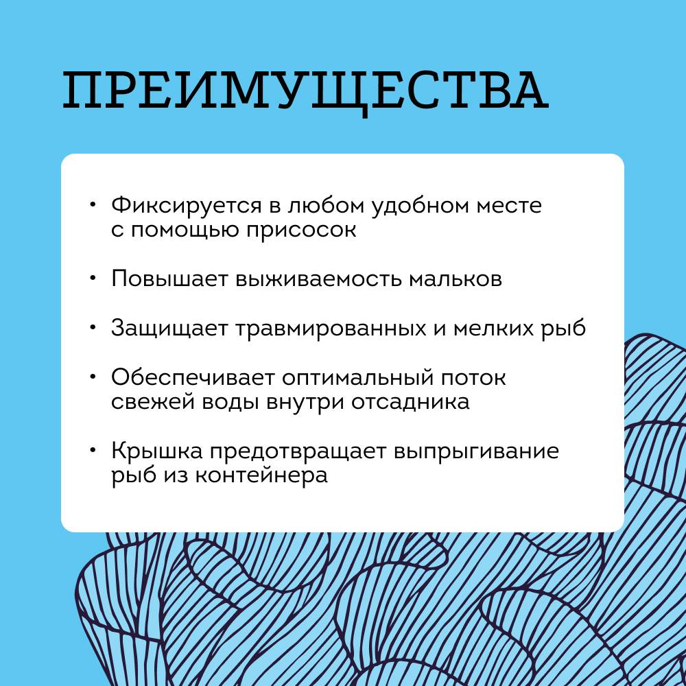 Предназначен для безопасного содержания мальков и аквариумных рыб, которых необходимо изолировать.