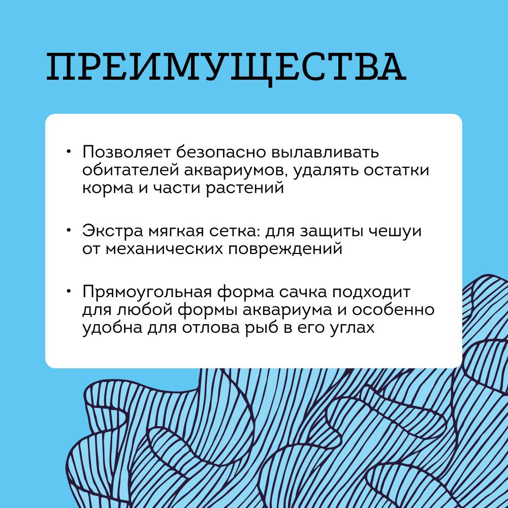 - Прямоугольная форма сачка подходит для любой формы аквариума и особенно удобна для отлова рыб в его углах.