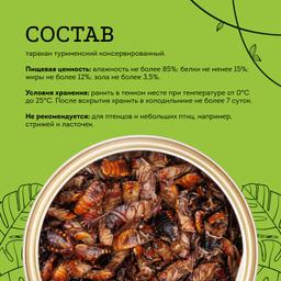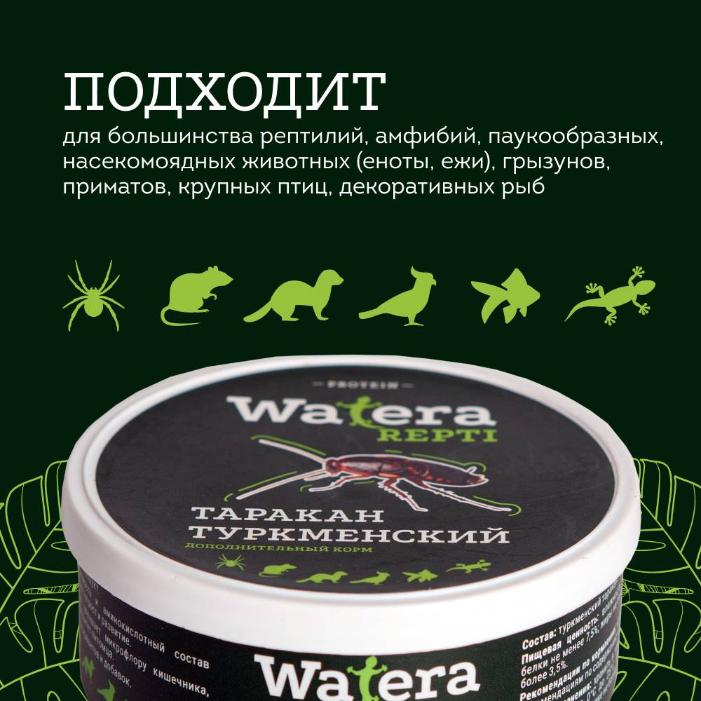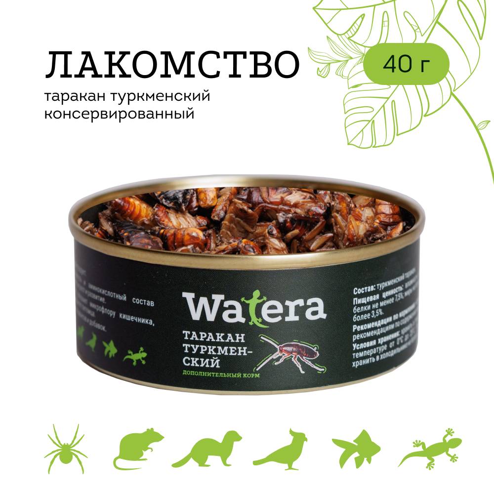 Таракан туркменский консервированный от Watera – универсальное лакомство для большинства рептилий, амфибий, паукообразных, насекомоядных животных (еноты, ежи), грызунов, приматов, крупных птиц, декоративных рыб и других экзотических питомцев.