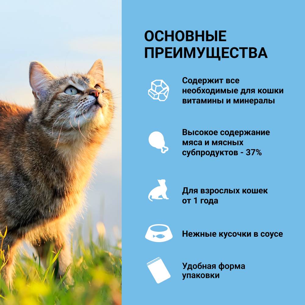 - Сочные, нежные кусочки с мясом или рыбой в сытном соусе подарят настоящее удовольствие Вашей кошке.