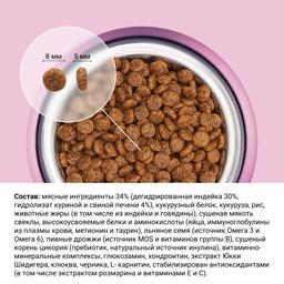 мясные ингредиенты 34% (дегидрированная индейка 30%, гидролизат куриной и свиной печени 4%), кукурузный белок, кукуруза, рис, животные жиры (в том числе из индейки и говядины), сушеная мякоть свеклы, высокоусвояемые белки и аминокислоты (яйца, иммуноглобулины из плазмы крови, метионин и таурин), льняное семя (источник Омега 3 и Омега 6), пивные дрожжи (источник MOS и витаминов группы В), сушеный корень цикория (пребиотик, натуральный источник инулина), витаминно-минеральные комплексы, глюкозамин, хондроитин, экстракт Юкки Шидигера, клюква, черника, Lкарнитин, стабилизирован антиоксидантами (в том числе экстрактом розмарина и витаминами Е и С).