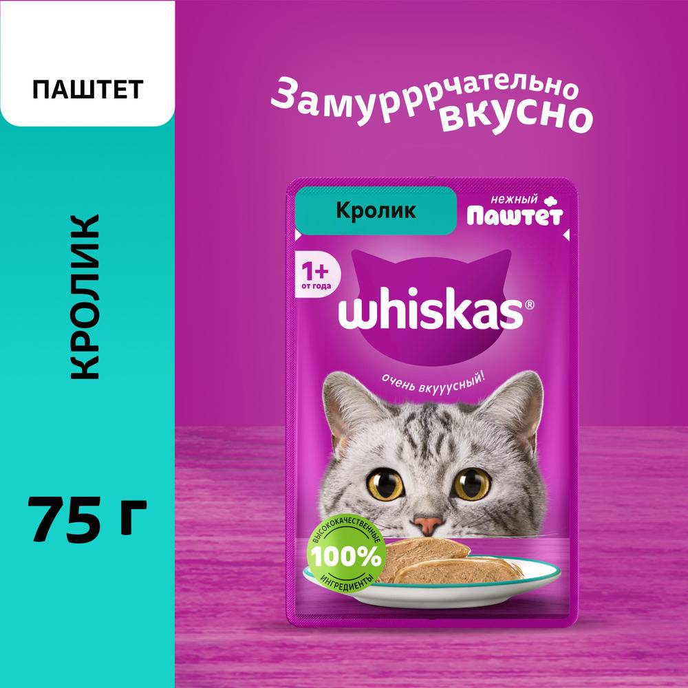 Аппетитный паштет с кроликом подарит вашей любимице настоящее удовольствие. Рацион Whiskas® содержит все необходимое, чтобы еда вашей кошки была не только вкусной, но и полезной. Whiskas® поддержит иммунитет, позаботится о здоровом пищеварении и здоровье кожи и шерсти вашей кошки. Подходит для стерилизованных котов и кошек.