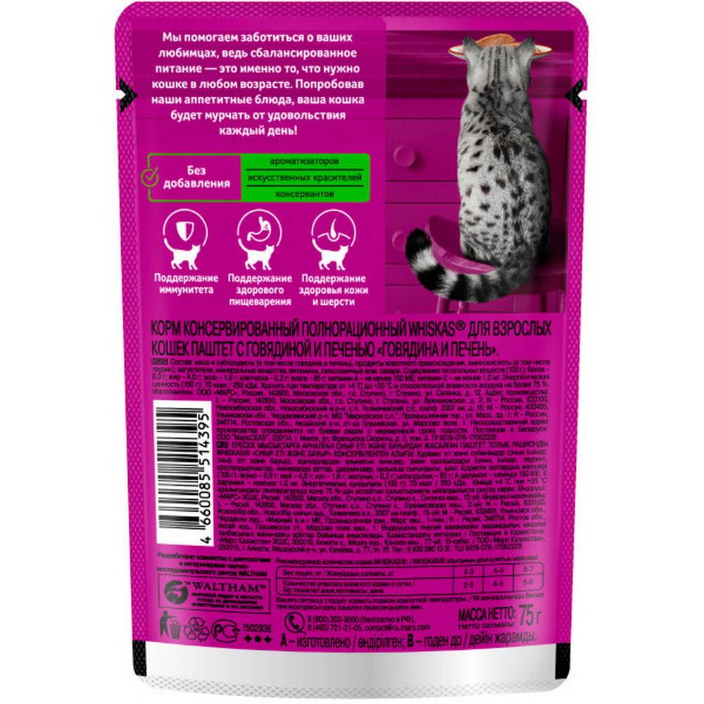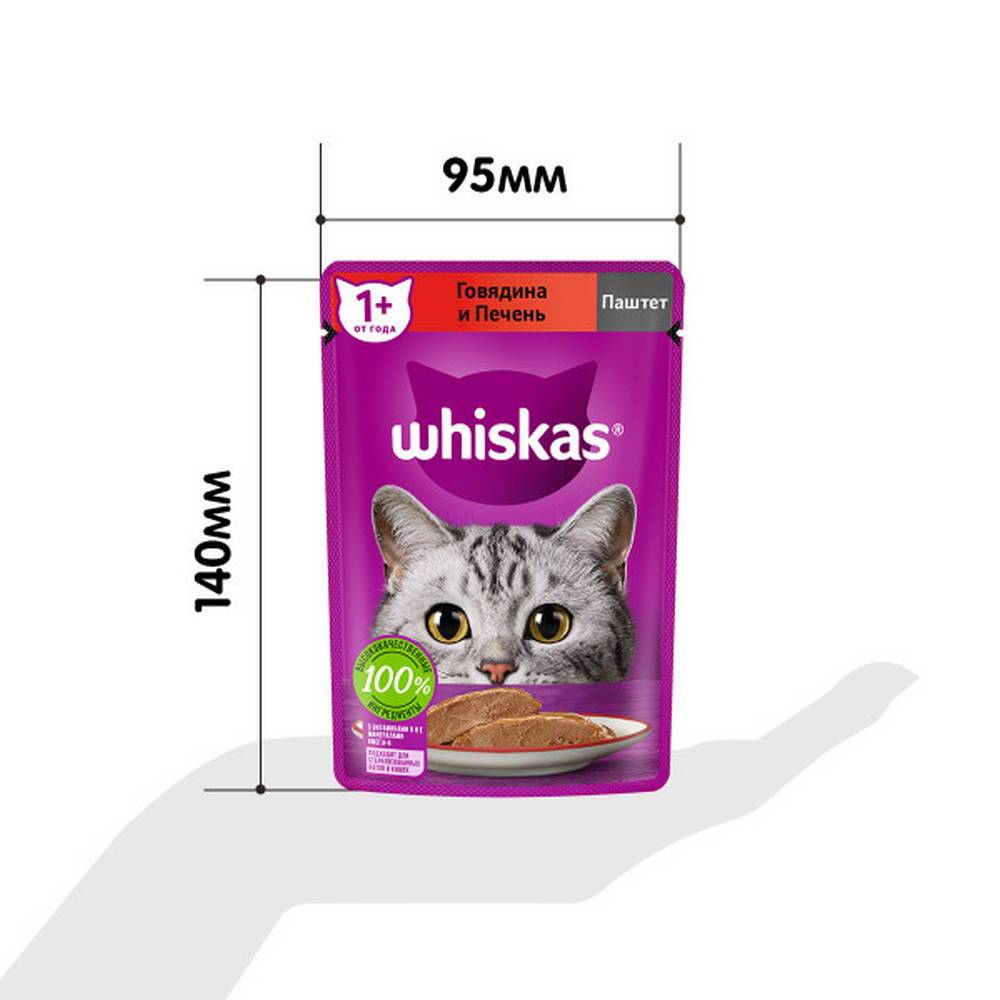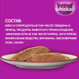 Это сбалансированный рацион, приготовленный именно так, как любит ваша кошка. Аппетитный паштет с говядиной и печенью подарит вашей любимице настоящее удовольствие. Жизнь замурррчательна, ведь рацион Whiskas содержит все необходимое, чтобы еда вашей кошки была не только вкусной, но и полезной. Whiskas поддержит иммунитет, позаботится о здоровом пищеварении и здоровье кожи и шерсти вашей кошки. Подходит для стерилизованных котов и кошек.
