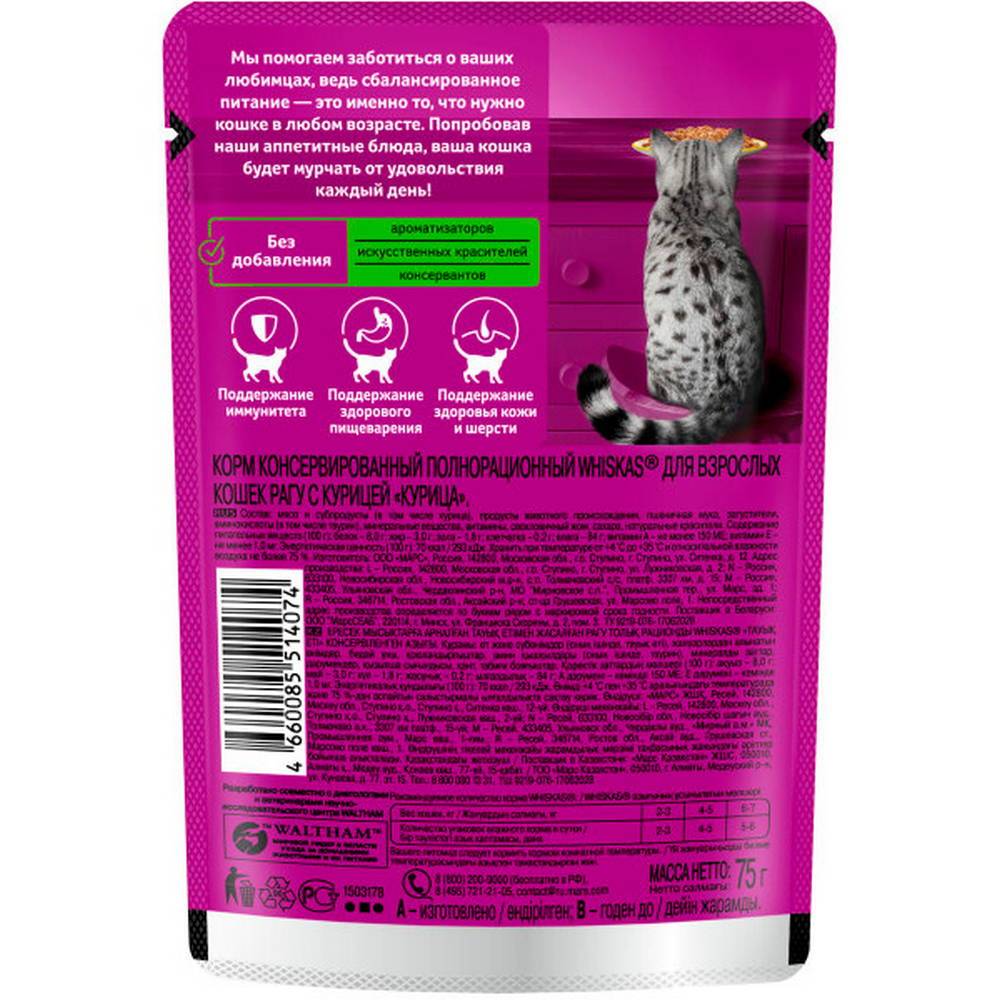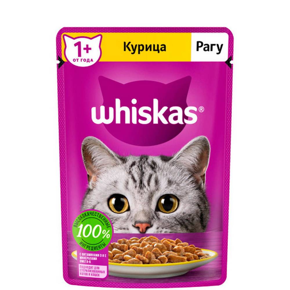 Это сбалансированный рацион, приготовленный так, как любит ваша кошка. Аппетитное рагу с курицей в густом соусе обязательно понравится вашей любимице. Жизнь замуррчательна, ведь рацион Whiskas содержит все необходимое, чтобы еда вашей кошки была не только вкусной, но и полезной. Whiskas поддержит иммунитет, позаботится о здоровом пищеварении и здоровье кожи и шерсти вашей кошки. Подходит для стерилизованных котов и кошек.