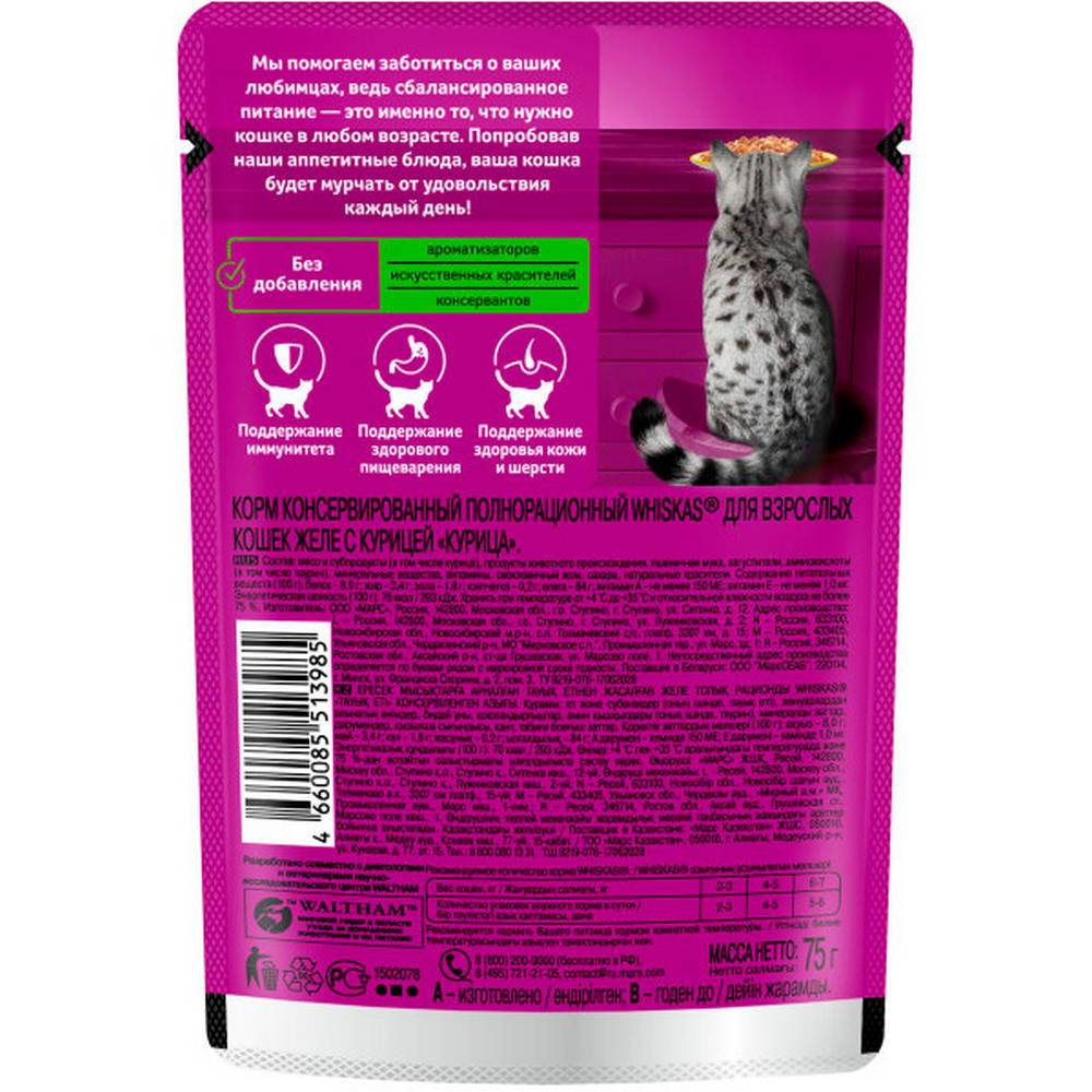 Это сбалансированный рацион, приготовленный именно так, как любит Ваша кошка. Отборные мясные кусочки с курицей в аппетитном желе придутся по вкусу Вашей любимице. Жизнь замурррчательна, ведь рацион Whiskas содержит все необходимое, чтобы еда вашей кошки была не только вкусной, но и полезной. Whiskas поддержит иммунитет, позаботится о здоровом пищеварении и здоровье кожи и шерсти вашей кошки. Подходит для стерилизованных котов и кошек. Рационы Whiskas для взрослых кошек это: