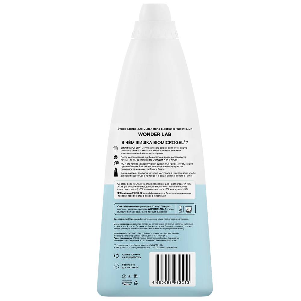 - Концентрированное жидкое средство для пола и другие экосредства WONDER LAB созданы на основе инновационного компонента Biomicrogel®, который сделан из овощей и фруктов.