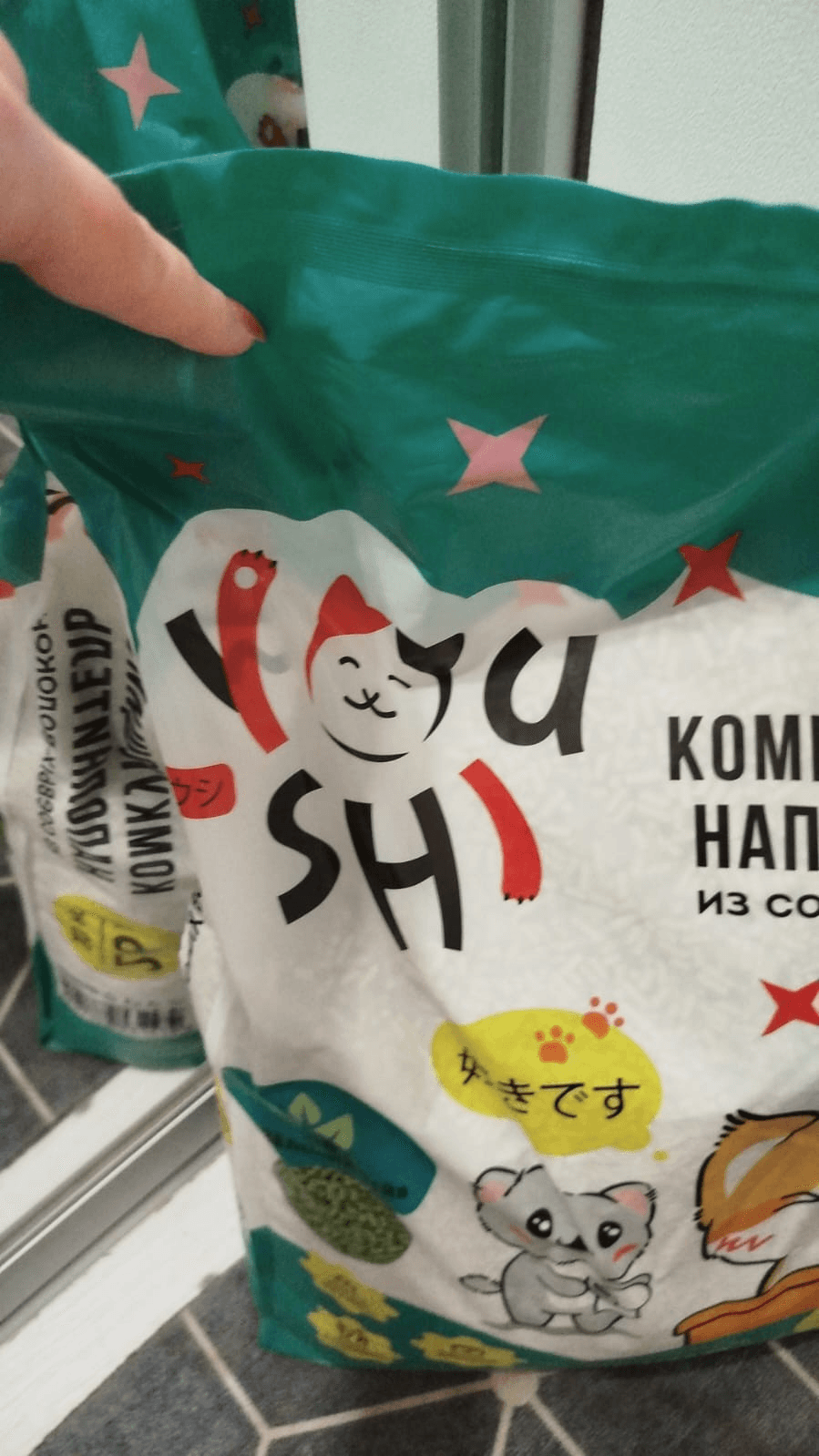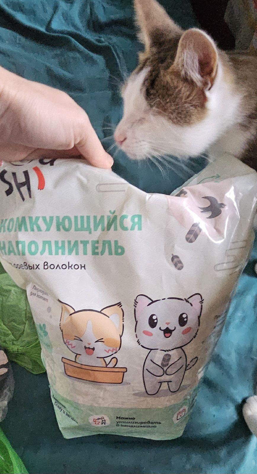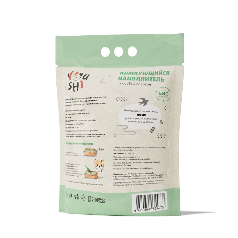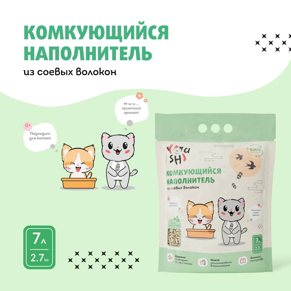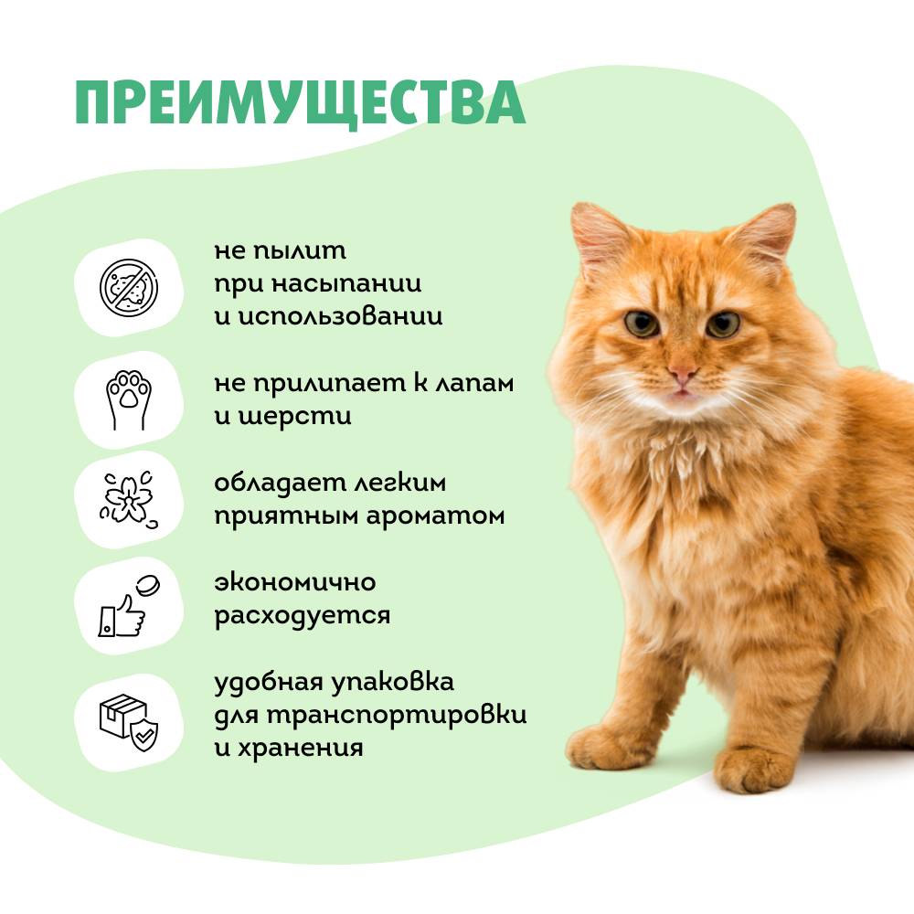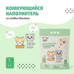 Биоразлагаемый комкующийся наполнитель из соевых волокон быстро впитывает жидкость и нейтрализует неприятный запах.