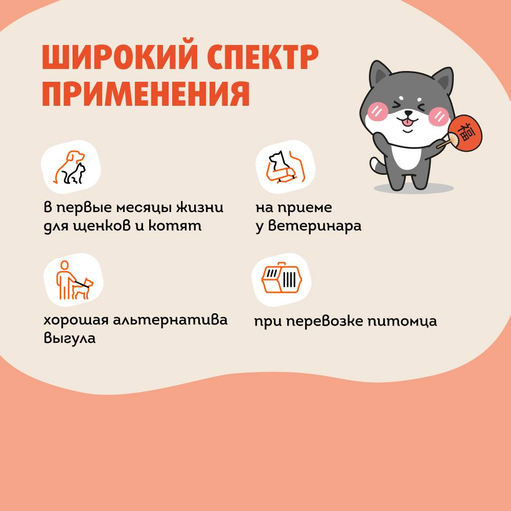 • Являются хорошей альтернативой выгула, пригодятся при перевозке четвероногого друга и на приеме у ветеринарного врача.