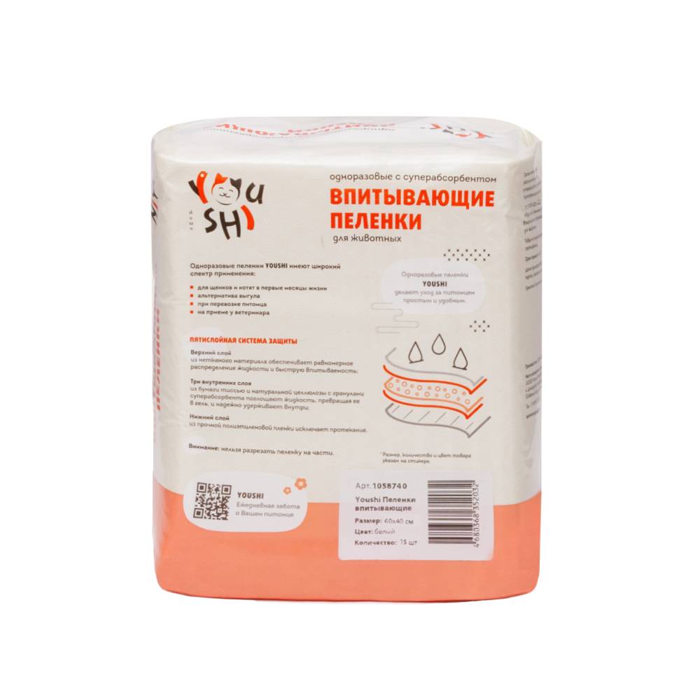 Youshi Пеленки одноразовые впитывающие 60х40 см (15 шт.) с суперабсорбентом для собак и кошек, белые