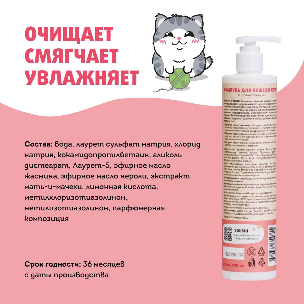 Шампунь для кошек и котят от бренда Youshi бережно очищает шерсть и кожные покровы, придает мягкость и легкий приятный аромат шубке питомца.