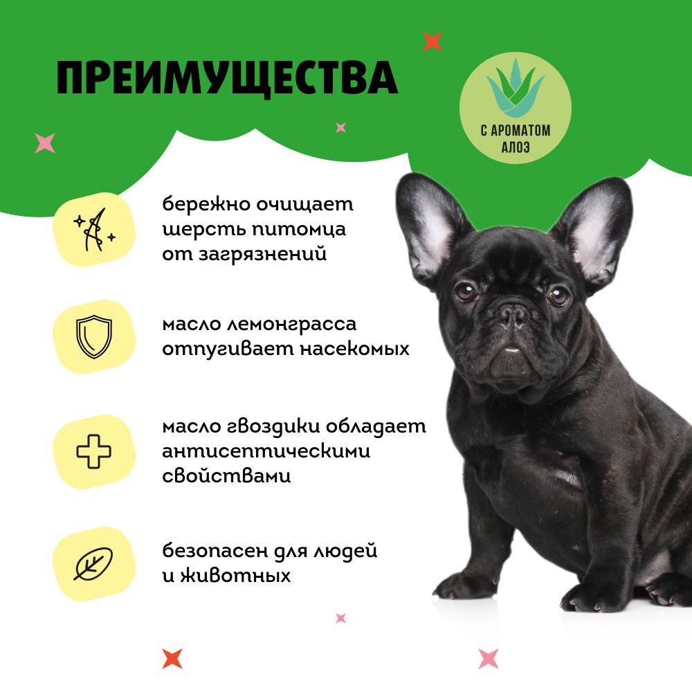 - Средство бережно очищает шерсть питомца от загрязнений, успокаивает и заживляет кожу.
