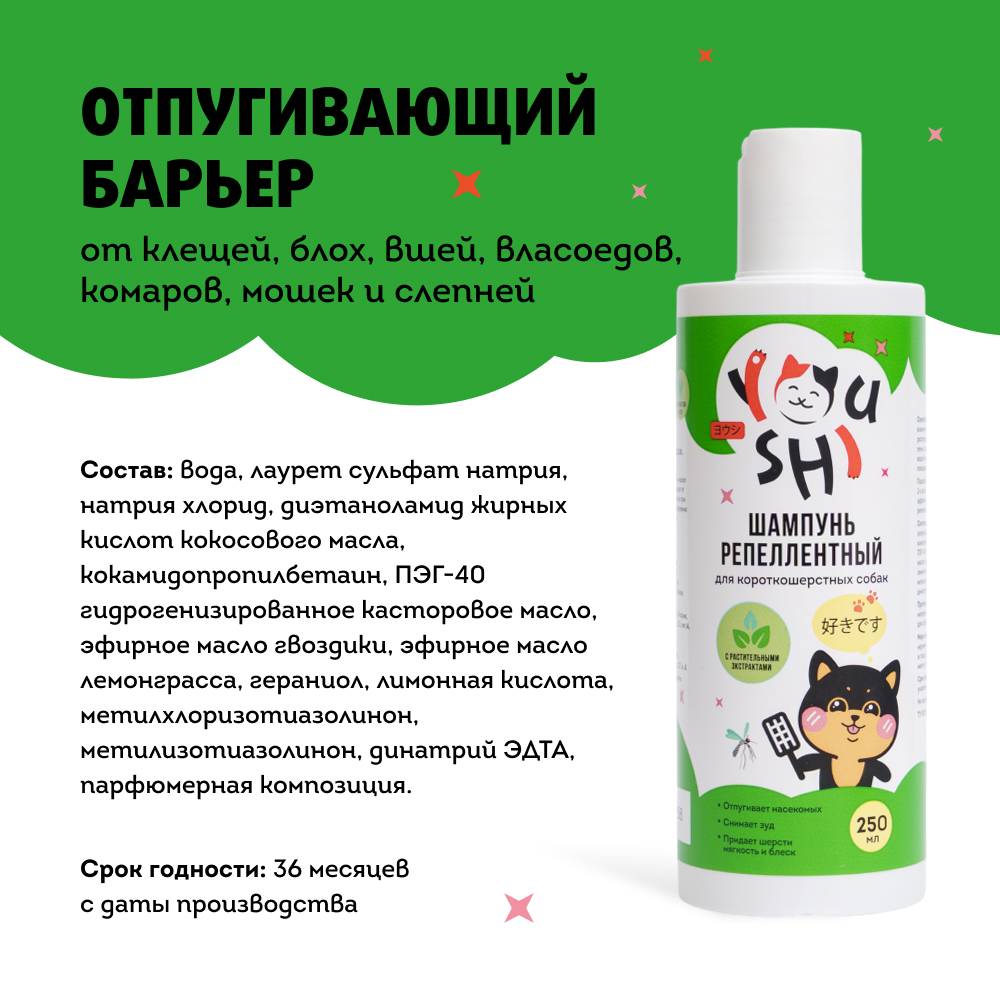 Шампунь Youshi на основе натуральных масел создает отпугивающий барьер (репеллентную защиту) от клещей, блох, вшей, власоедов, комаров, мошек и слепней.