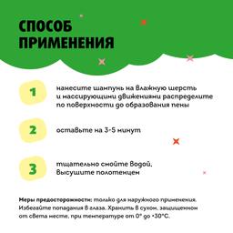 Способ применения: нанесите шампунь на влажную шерсть и массирующими движениями распределите по поверхности до образования пены, оставьте на 3-5 минут, тщательно смойте водой, высушите полотенцем. Избегайте попадания в глаза и уши питомца.