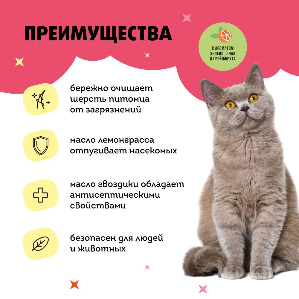 - Средство бережно очищает шерсть питомца, успокаивает и заживляет кожу.