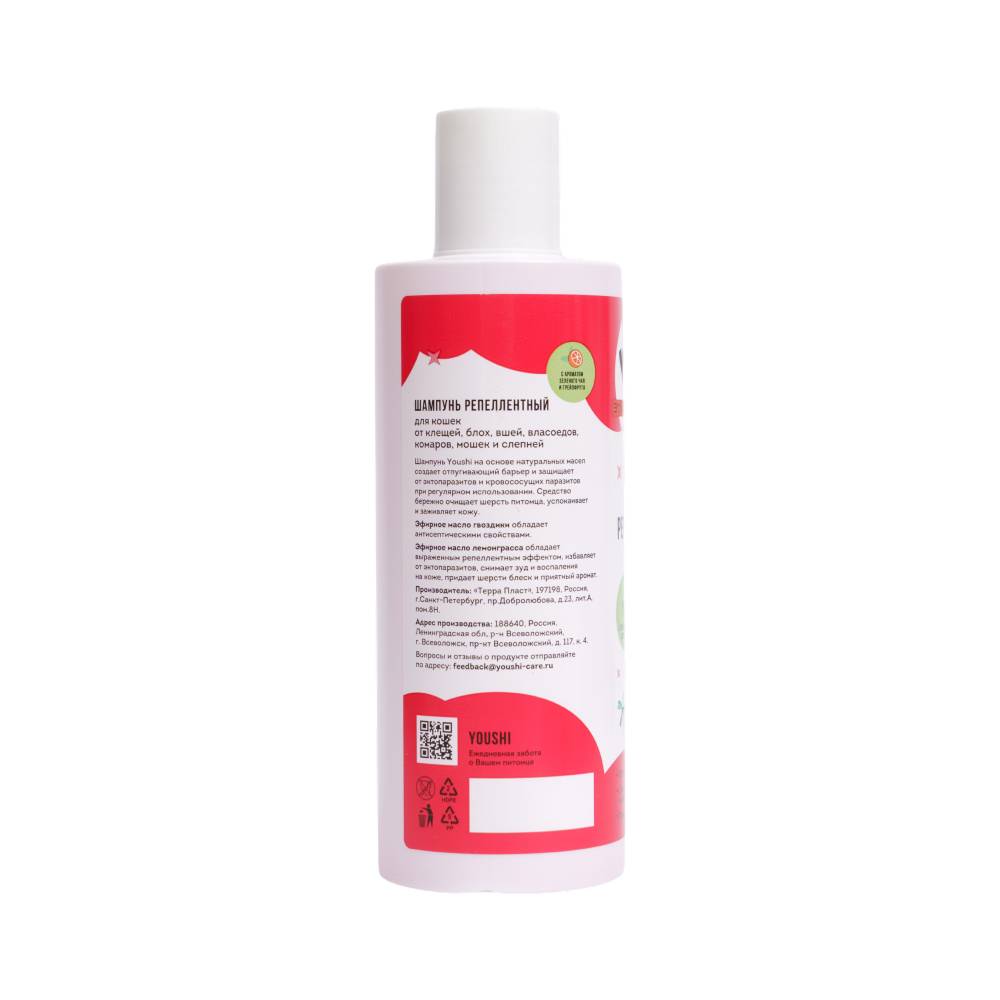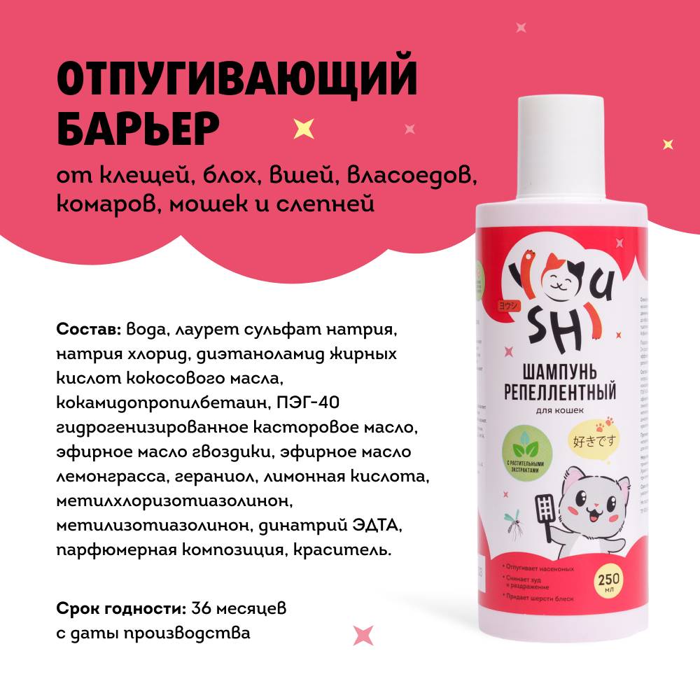 Шампунь Youshi на основе натуральных масел создает отпугивающий барьер (репеллентную защиту) от клещей, блох, вшей, власоедов, комаров, мошек и слепней.
