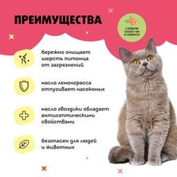 - Эфирное масло лемонграсса обладает выраженным репеллентным эффектом, избавляет от эктопаразитов, снимает зуд и воспаления на коже, придает шерсти блеск и приятный аромат.