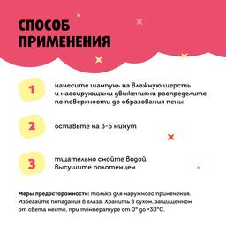 Способ применения: нанесите шампунь на влажную шерсть и массирующими движениями распределите по поверхности до образования пены, оставьте на 3-5 минут, тщательно смойте водой, высушите полотенцем.