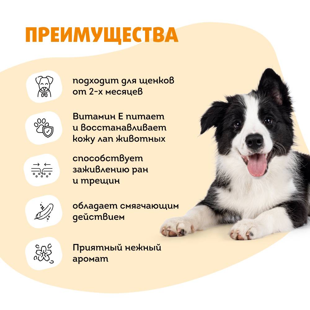 - Витамин Е питает и восстанавливает кожу лап, обеспечивая быстрое заживление мелких ран и трещин.